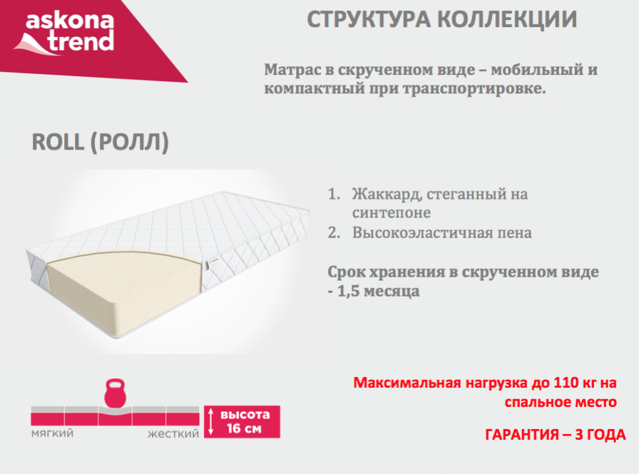 - Trend Roll - it is a springless mattress with high orthopedic properties. Its height is 16 cm, and the maximum load should not exceed 110 kg. Has a jacquard cover. Available in two versions - “Trend Roll” of high rigidity and “Trend Roll” of medium hardness.