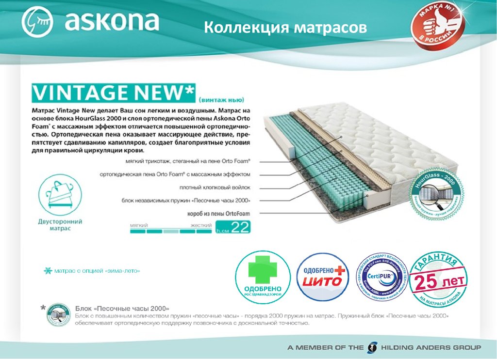 Today, the Ascona brand offers its customers more than 800 different models of mattresses. The most popular are the following models: