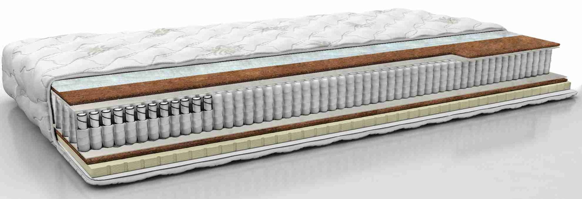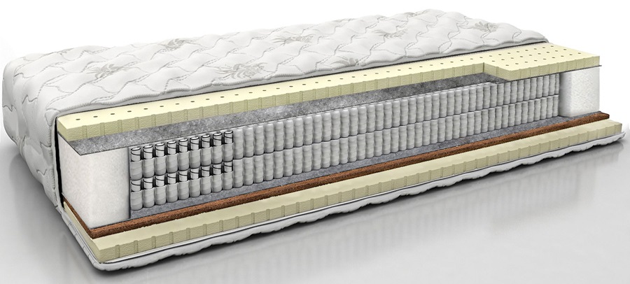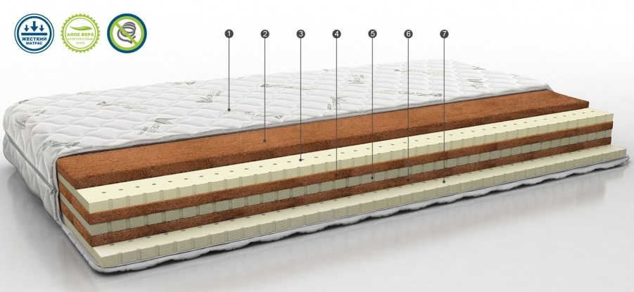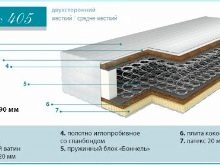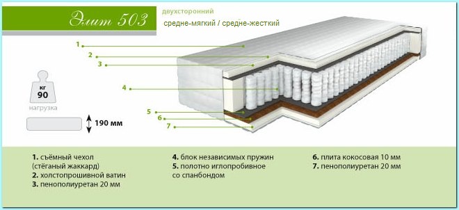 - "Elite". Filling with coconut and latex allows you to produce mattresses of different degrees of stiffness. Such models consist of a removable antibacterial jacquard cover, a block of independent springs, batting, polyurethane foam and needle-punched cloth.