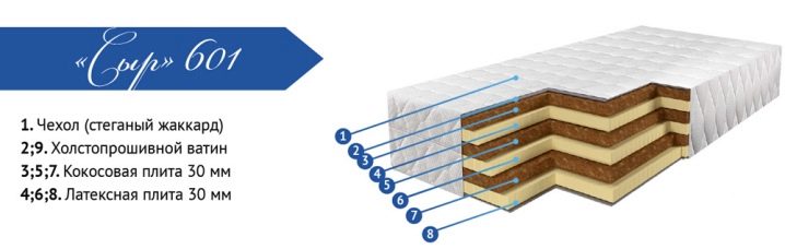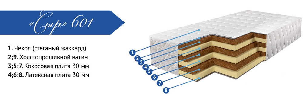 - Model "Cheese 601" made of three coconut, three latex plates and batting. All components are eco-friendly, non-allergenic, durable, well ventilated. Although there is no spring block, springless models provide comfort, sound sleep, keep their shape perfectly, do not undergo deformations after use for a long time.