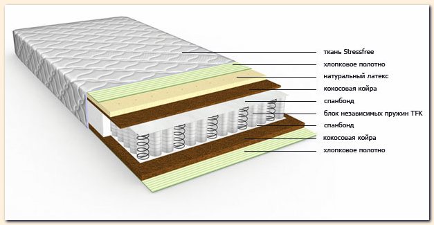 - "Tandem". Designed specifically for people with great weight. Available, has a double spring unit (to prevent deformation), easy to use. Materials: non-woven fabric “SpanBel”, latex, two spring blocks, coconut plate, polyurethane foam.