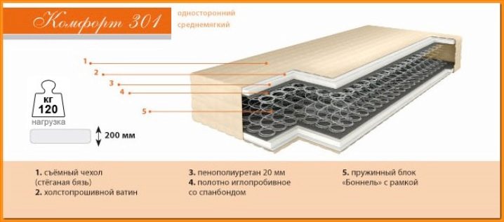 - "Comfort". Available in different stiffness products. There are models where in the same mattress the two halves have different stiffness. The peculiarity of the spring block is that each double cone spring has a separate cover, which makes it possible to achieve a high orthopedic effect. Such specimens consist of a removable cover, a 20-mm sheet of polyurethane foam, the Bonnel block, canvas-stitched batting and needle-punched cloth with spunbond.
