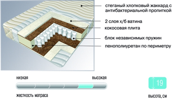 The mattress on the block of independent springs of reduced height. It has excellent supporting properties, provides muscle relaxation and proper sleep. Fillers of coconut coir and cotton felt give the product the necessary rigidity. Antibacterial impregnation of a jacquard cover will maintain a wonderful microclimate and freshness.