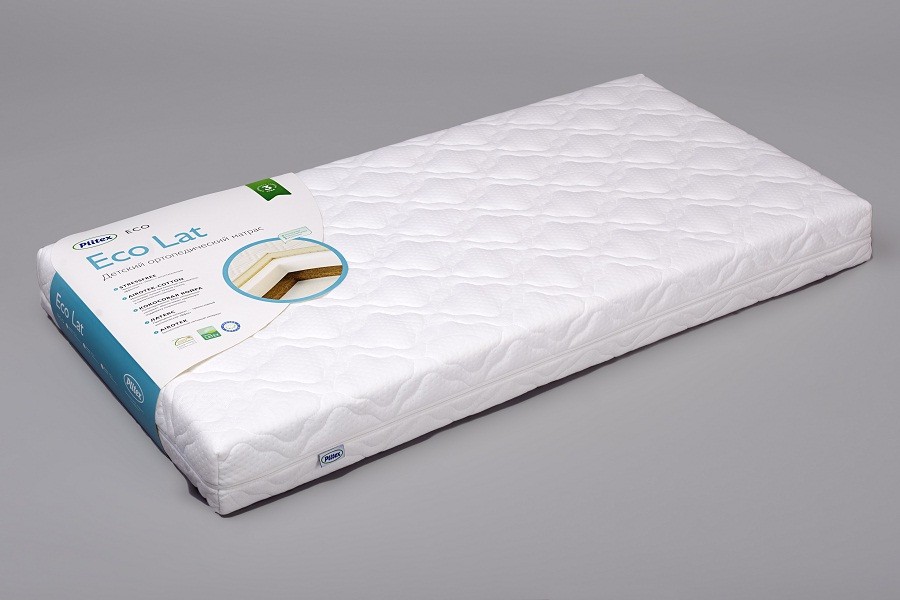 - EcoLat model part of the same series of springless double-sided mattresses, has similar characteristics. In addition, a 10 mm layer of latex is made from the extract of the juice of a rubber tree. The filler (80 mm) “Hollcon” is made using a special technology: the fibers are stacked vertically and each of them performs the function of a small spring.Model size: 125x65 at a height of 12 cm.