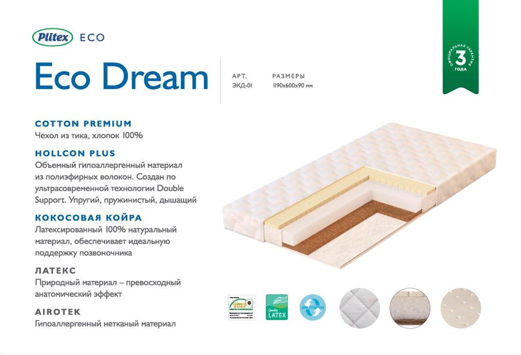 - "EcoDream" with dimensions of 119x60x11 cm, it has all the positive characteristics of models of the Eco series with a removable teak cover - 100% cotton. The mattresses of this series are distinguished by high strength, wear resistance, hypoallergenic, air permeability and moisture resistance.