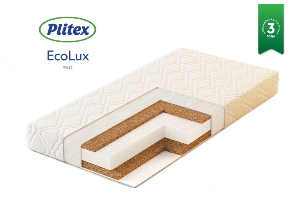 - EcoLux model refers to two-way. Combines layers airotek-cotton and latex coconut coir. Different sides differ in the degree of stiffness. A 3 cm layer of coconut coir provides greater rigidity and is suitable for sleeping newborns. After a year, the mattress can be turned over to the side with moderate hardness with a layer of 1 cm of coconut coir. The model has a unique two-layer removable cover of quilted StressFree fabric. It consists of two layers - 100% cotton fibers and a porous material. The cover is not static. Size: 50x60x12 cm.