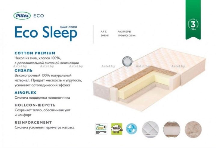 - "EcoSleep" (winter-summer) - springless mattress size 1190x600 with a height of 120 mm. Sisal and wool holkon, materials of different stiffness and thermal characteristics set certain qualities to the sides of the mattress. Sisal is the fiber of an agave plant. Hollcon wool consists of 60% merino wool and 40% silicone fibers. Sisal more rigid, wool hollkon soft, well-preserving heat, perfectly absorb moisture. The perimeter of the mattress is reinforced with polyurethane foam blocks, which allows to keep the shape for a long time.Cover material - natural tick, supplemented with 3D mesh for maximum ventilation.