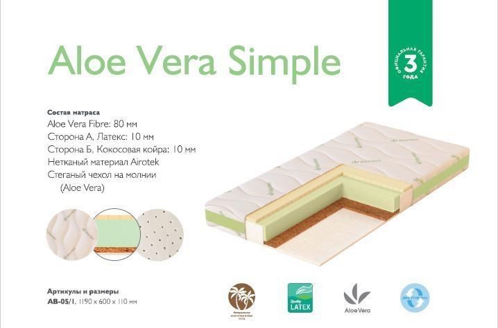 - "Plitex Aloe Vera Simple" - double-sided sample. A special feature is the Aloe Vera fiber used. It strengthens the immune system, facilitates the breathing of the baby. The model uses a filler made in Germany. One of the sides of medium stiffness, the second - softer and more elastic. Removable case made of knitted fabric containing aloe vera. Dimensions: length - 1190 mm, width 600 mm, height - 110 mm.