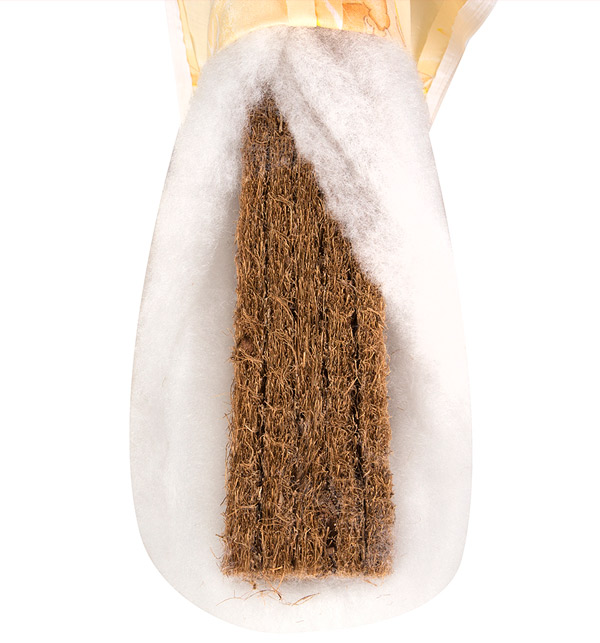 - Needle punch method. Specialists nail the coconut fiber to the fabric base. It turns out a hard material that preserves the properties of natural coir, but at the same time it becomes less durable and durable. The fiber becomes brittle and less resistant to stress, which significantly reduces the shelf life of the finished mattress. Keep this in mind if you want to purchase products for a long time.