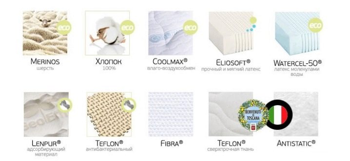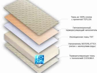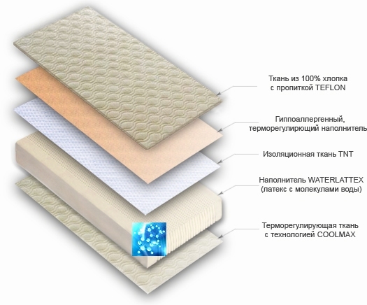- "Waterlattex" - medium hard mattress filled with latex foam. Available with covers of two options: with a fully cotton and a combination, when one side is made of wool, and the other is made of cotton;