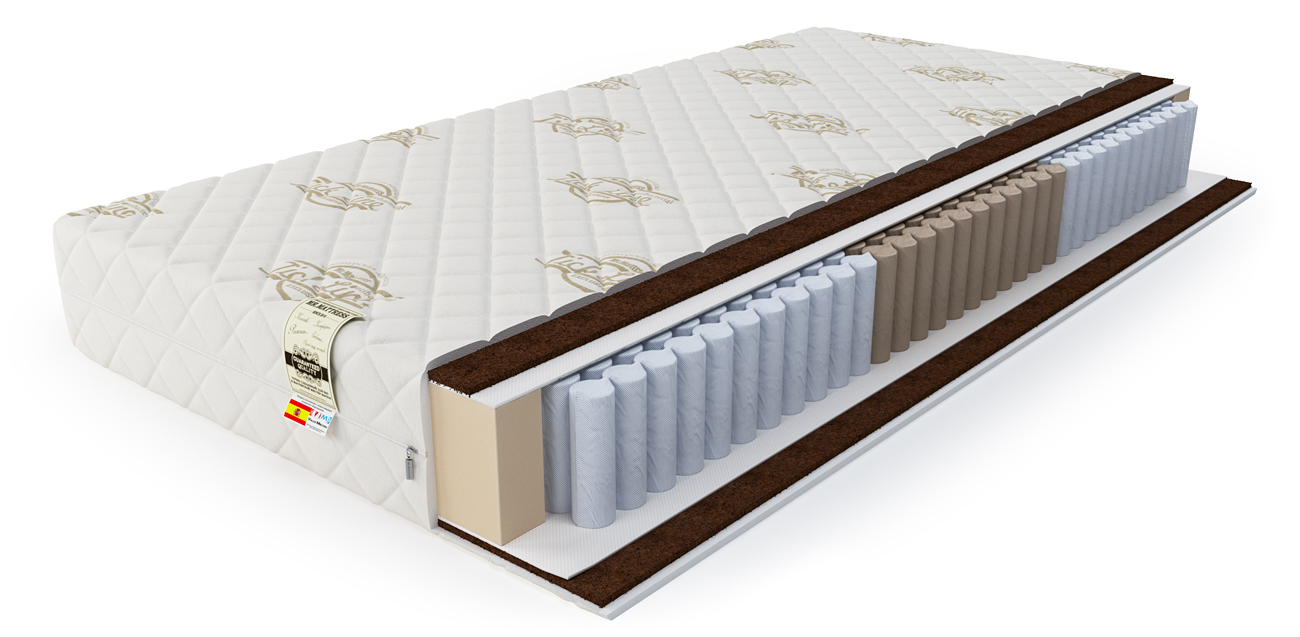 As a cover, the manufacturer uses the quilted Tick Line package. Artificial latex 2 centimeters thick is applied inside the mattress. It has good elastic and elastic qualities. In addition to latex, one centimeter of natural coconut coir is used.