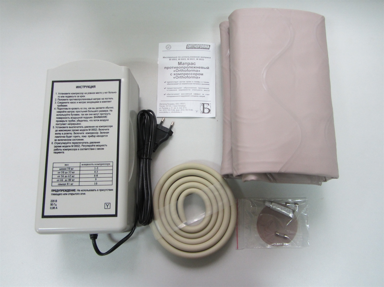 It is very important before use to carefully read the instructions for use. Anti-decubitus mattress is easily assembled in working condition. Cloth mattress spreads out. Then the connecting tubes are put on the nozzles located on the mattress and compressor. Next, the compressor is turned on at maximum power for the initial filling of cells or cylinders with air. After that, using the pressure regulator, the position that corresponds to the patient's weight is set: