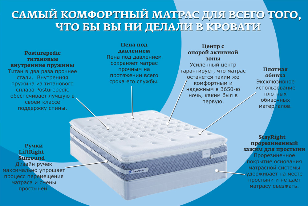 - In the Posturepedic system, the elasticity of the springs changes depending on the weight and movements lying on it. The design provides a perfectly flat surface, allows you to adapt to the weight and human anatomy.