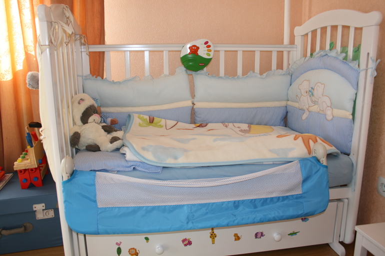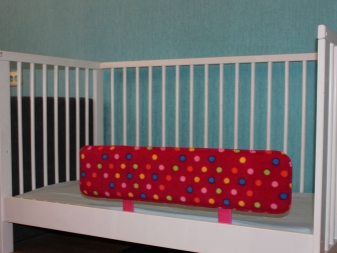 Also, young children have another problem. Since the built-in limiter, as a rule, is a series of vertical slats, very often the arms and legs of babies fall between them, which leads to pain, and sometimes injury. In this case, a soft curb is also needed, which will prevent such unpleasant situations. It is fastened around the perimeter of the crib and very often comes bundled with it.