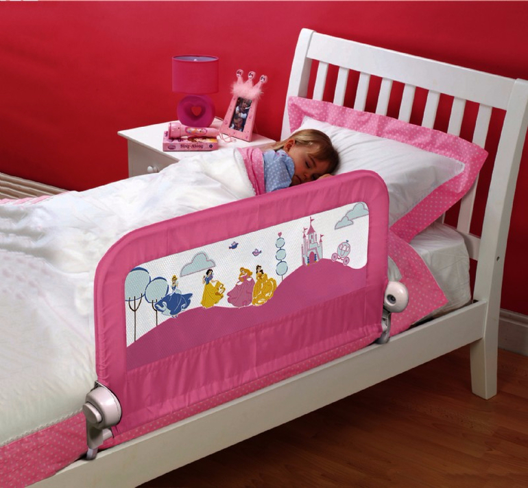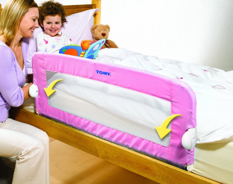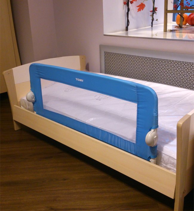 Bed restraints Tomy presented in pink and blue. The barrier is sheathed with a soft cloth so that the child does not hurt when in contact with it. The limiter is installed under the mattress, the width of which should be from 70 to 90 centimeters. The barrier is held in place by the weight of the mattress and the sleeper, at the other end has a bend of 7 centimeters to prevent slipping from under the mattress. In the pocket, located on the barrier, the child can put a favorite toy. If desired, it can be folded down to release access to the child. The price of such a device is about 3000 rubles.