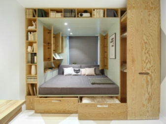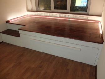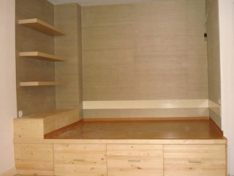 The podium can be as low as small boxes for trifles, as well as high. On the high podium will have to climb the stairs, which can also be made in the form of boxes. In this podium you can place not only departments for storing small items. You can completely replace their dressers and shelves in the closet.