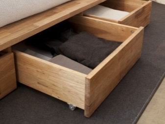 If the pedestal of the bed is much larger than the mattress, the boxes in it can be located not only on the side, but also on top.