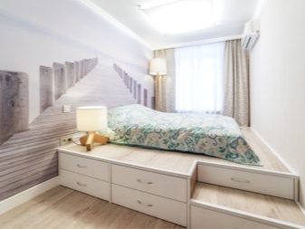 Bed-podium with drawers helps save space for storage of things, but at the same time it occupies a considerable area. Therefore, it is necessary to place it all the same in a spacious room.
