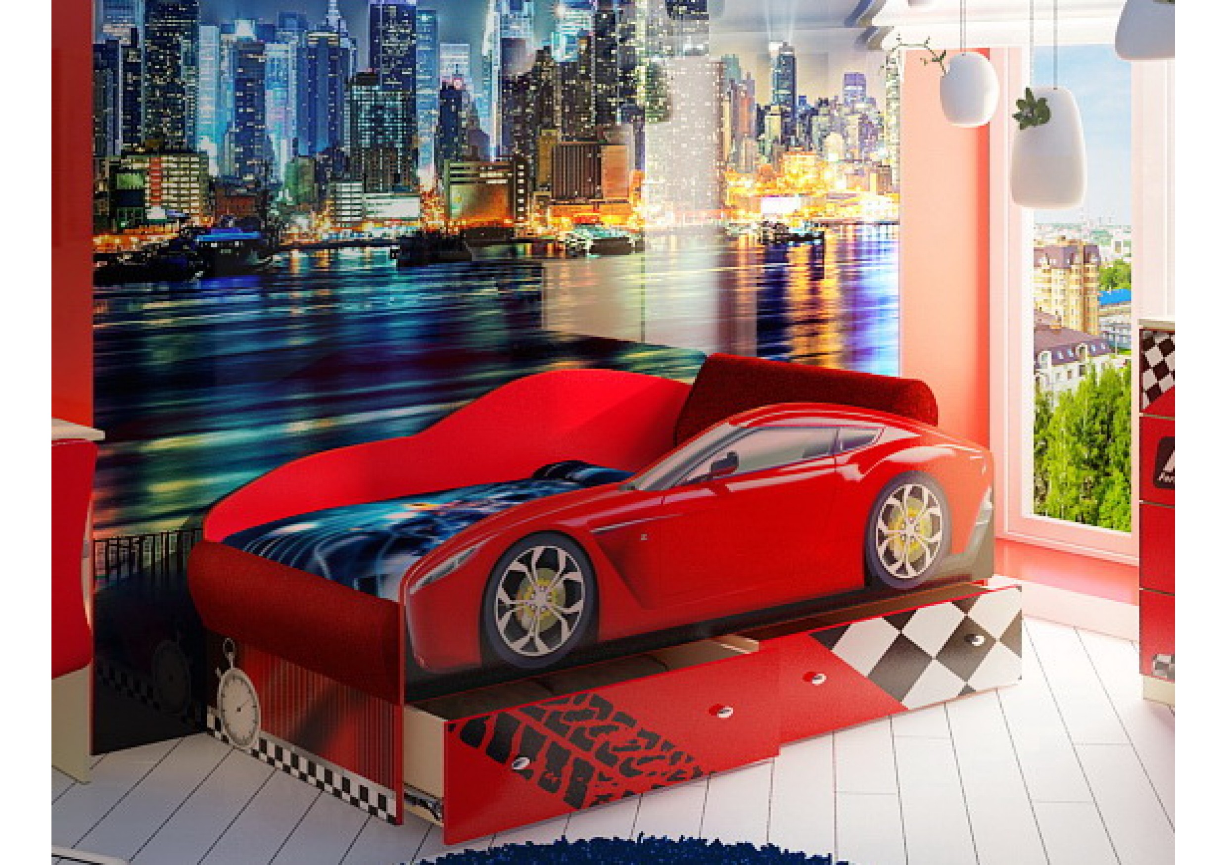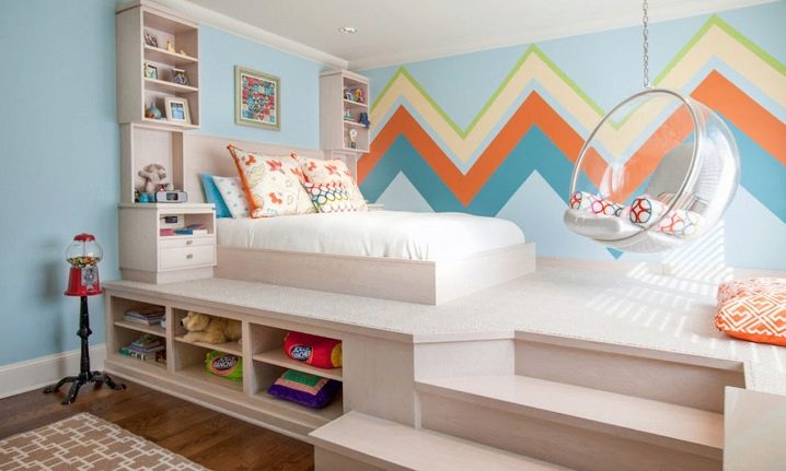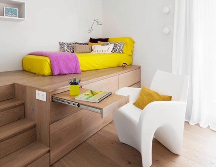 - Very often, designers use such furniture in children's rooms. So on the podium you can place not only the mattress, but a lot more. On the podium with drawers you can even place a bed-car for your rider. So you can create additional storage space for his toys. The bed can be located inside the podium, and the drawers will be placed on the side of it - for example, in the steps. This option is ideal for studio rooms. It allows you to place a full bed in a small apartment - and at the same time hide it from guests.