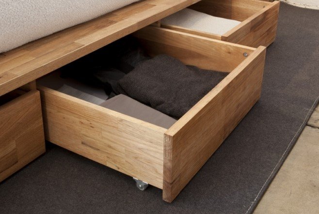 The ideal material for the manufacture of a bed-podium with drawers is an array of wood. This is an environmentally friendly material that is completely hypoallergenic.In addition, its strength is much higher than that of substitutes. The interior, where natural wood is used, always looks gorgeous. Such a bed will not be “afraid” of moisture, but its price is much higher than the cost of furniture made from other materials.