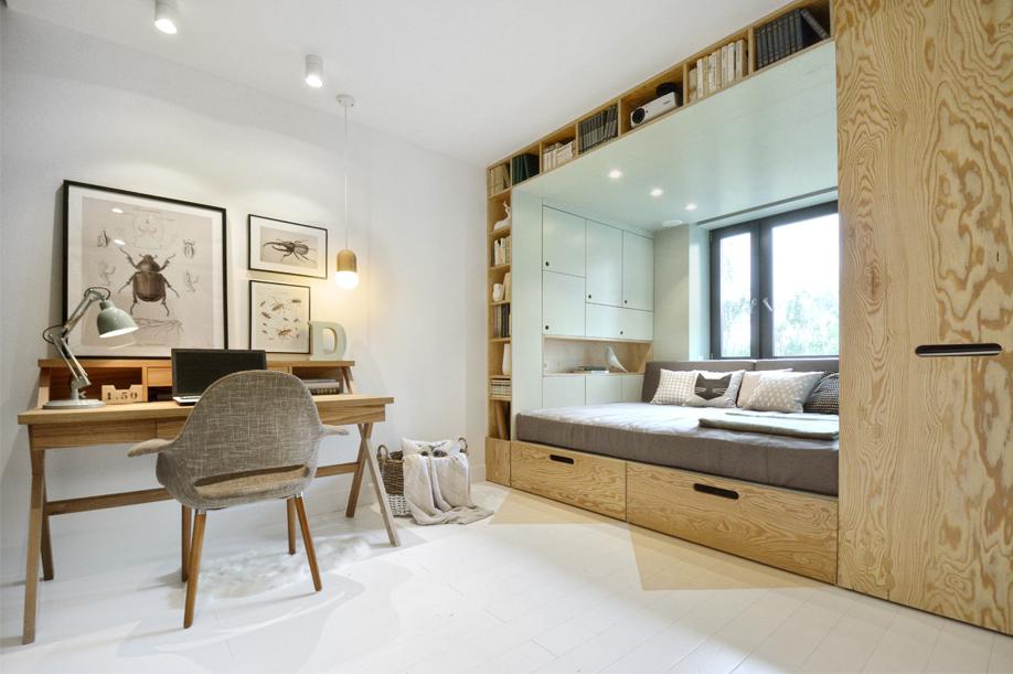 - High bed with drawers in the podium (in several rows). Under such a bed will ideally equip a niche in the room. It will combine not only storage space for bedding, but also much more, including shelves for books. In addition, such a podium can be equipped with a sliding table, thereby organizing a workplace for your students.