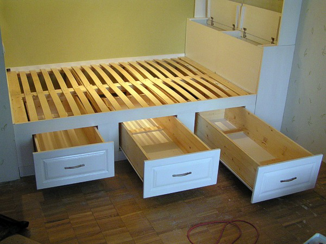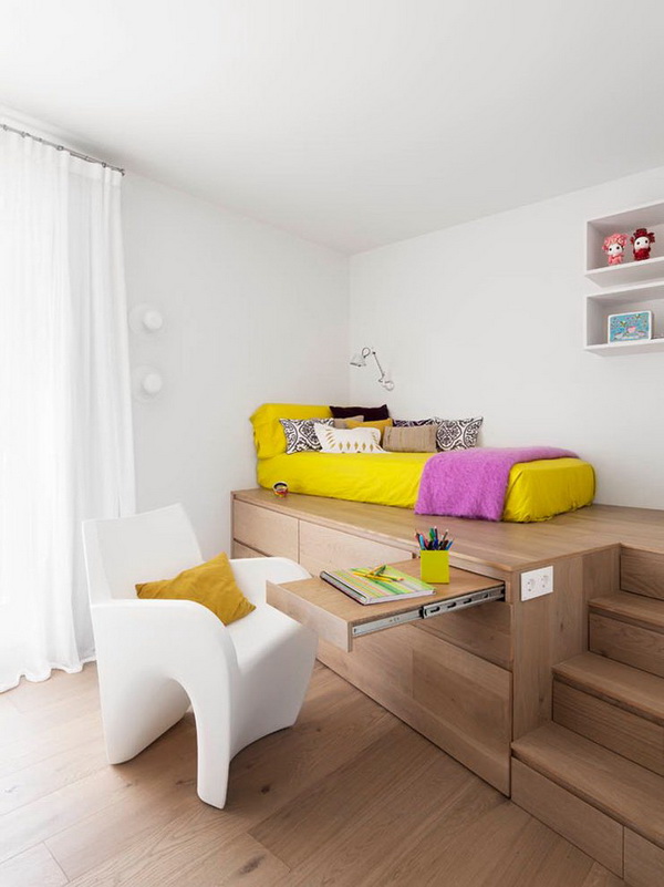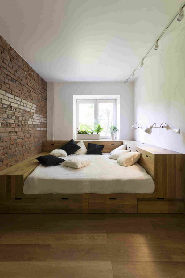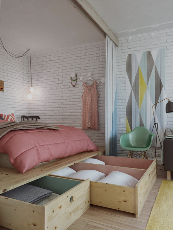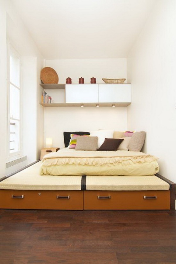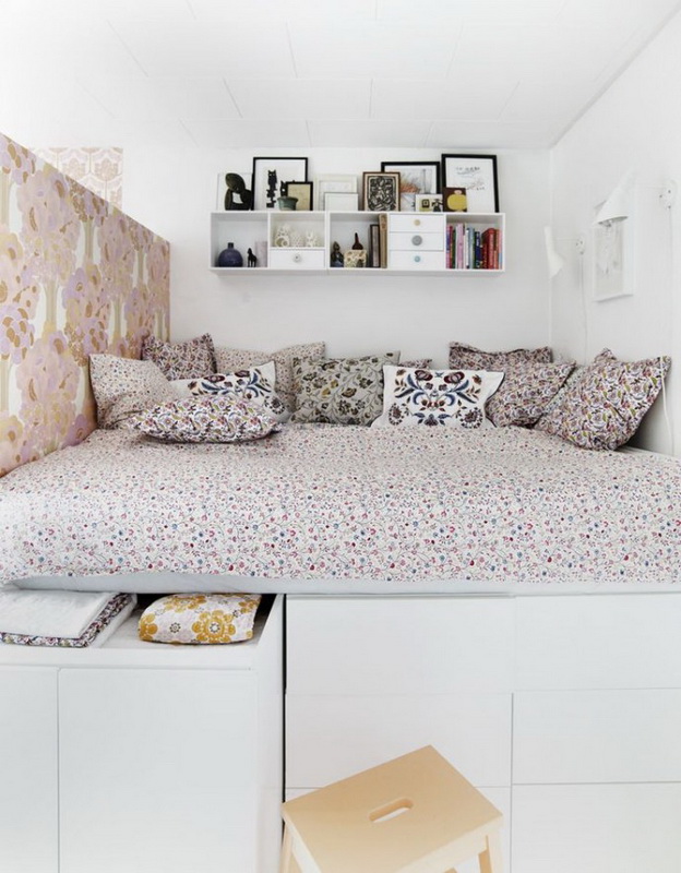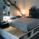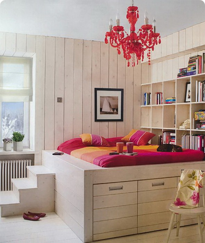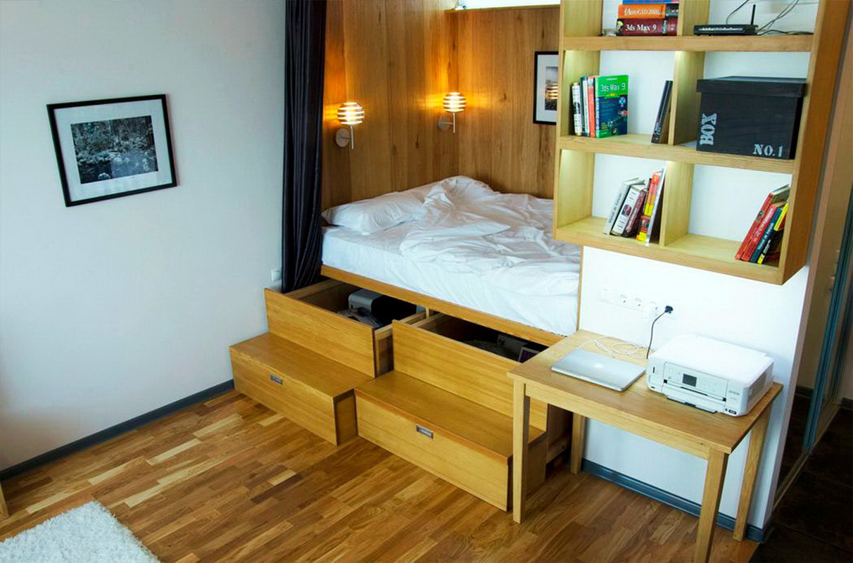 One of the best options is a classic podium on a solid frame basis with a bed or mattress at the top. Below you can build boxes for things that will eliminate the need to purchase an extra piece of furniture for their placement.