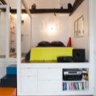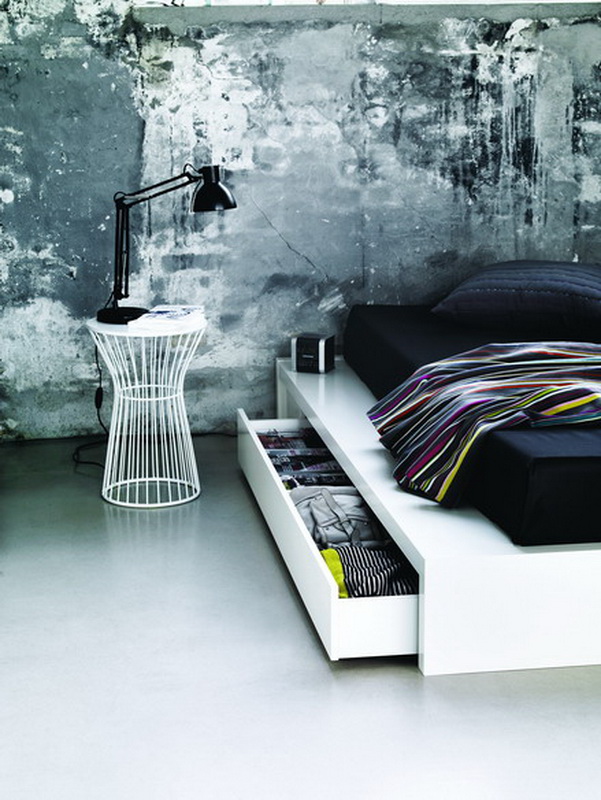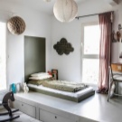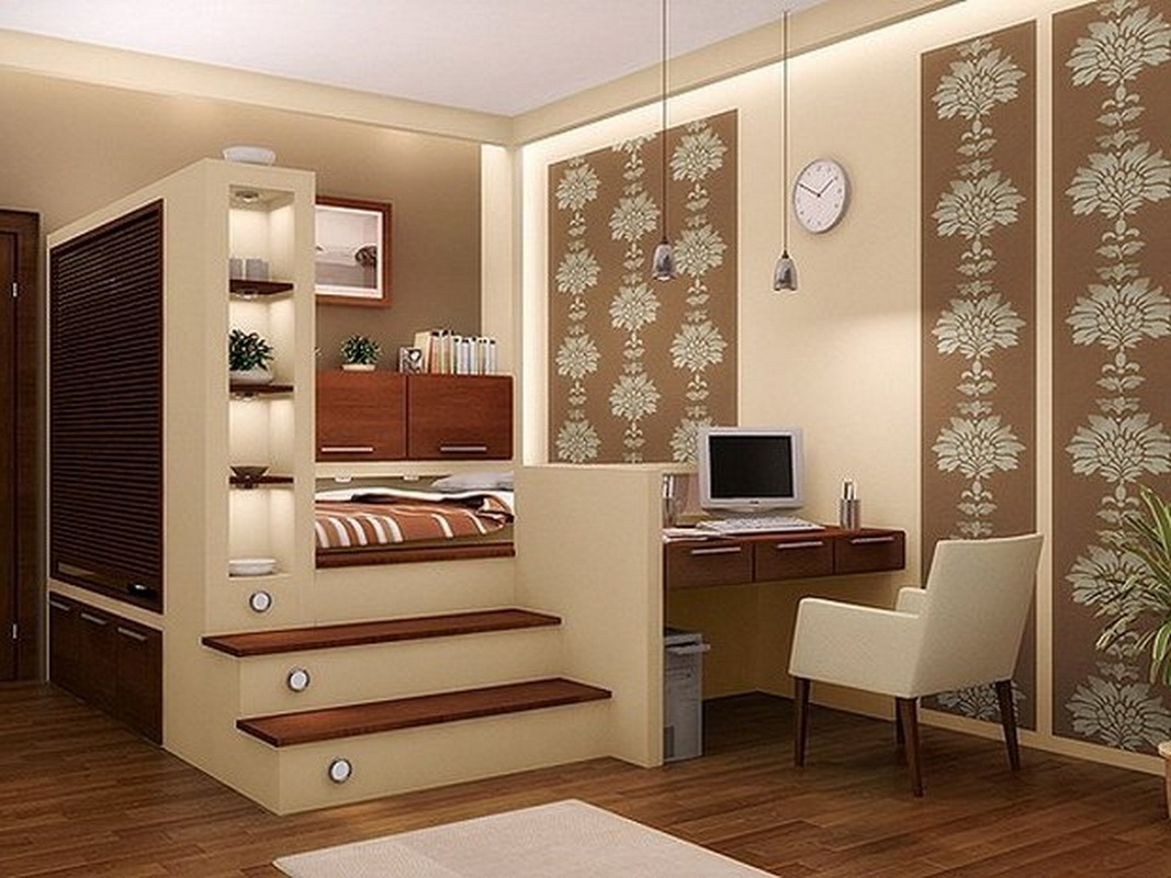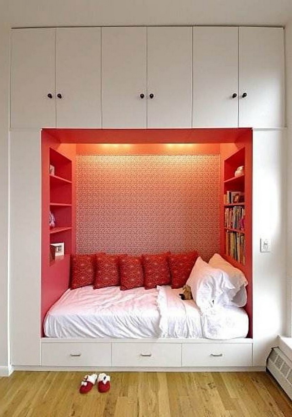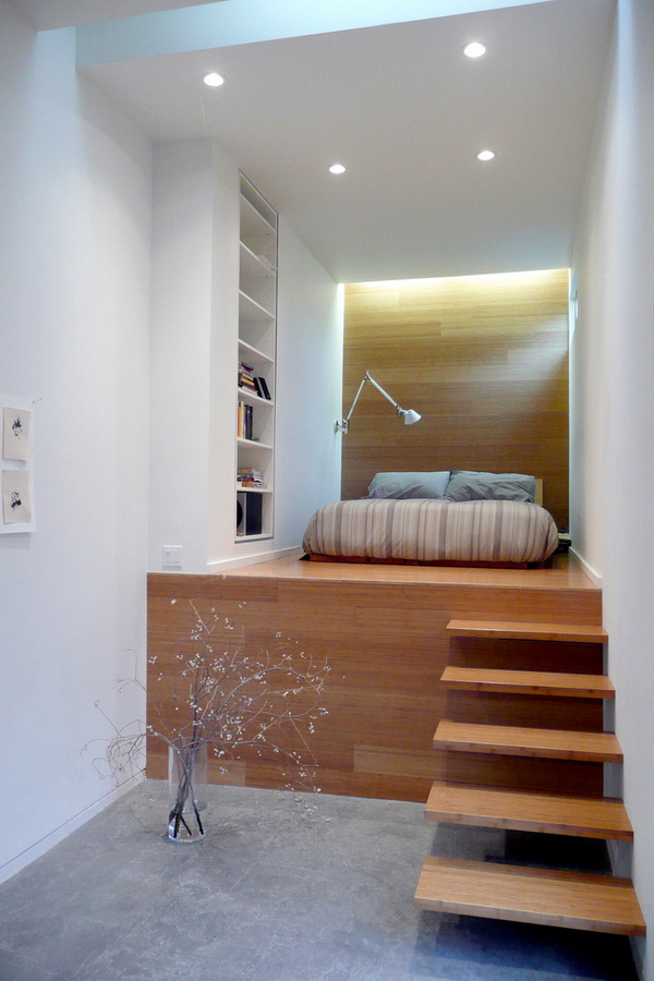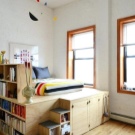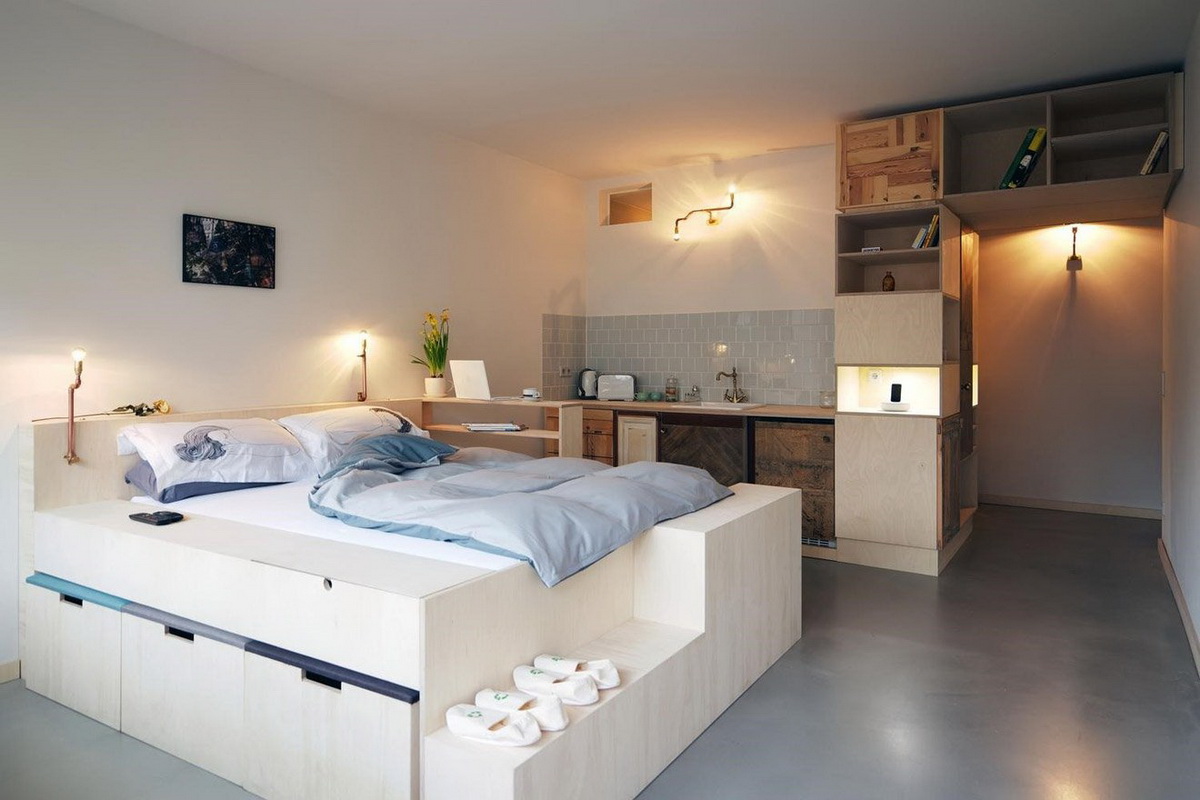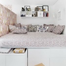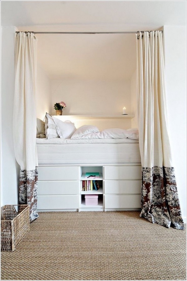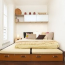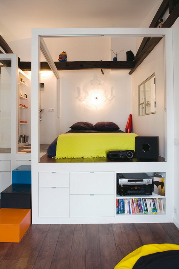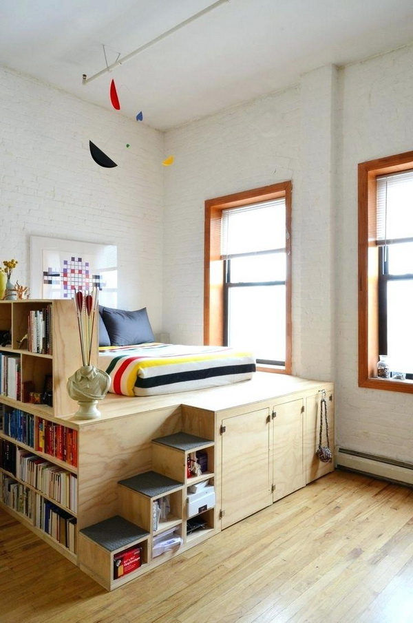 One of the best options is a classic podium on a solid frame basis with a bed or mattress at the top. Below you can build boxes for things that will eliminate the need to purchase an extra piece of furniture for their placement.