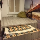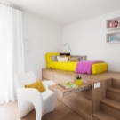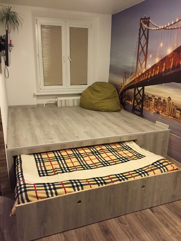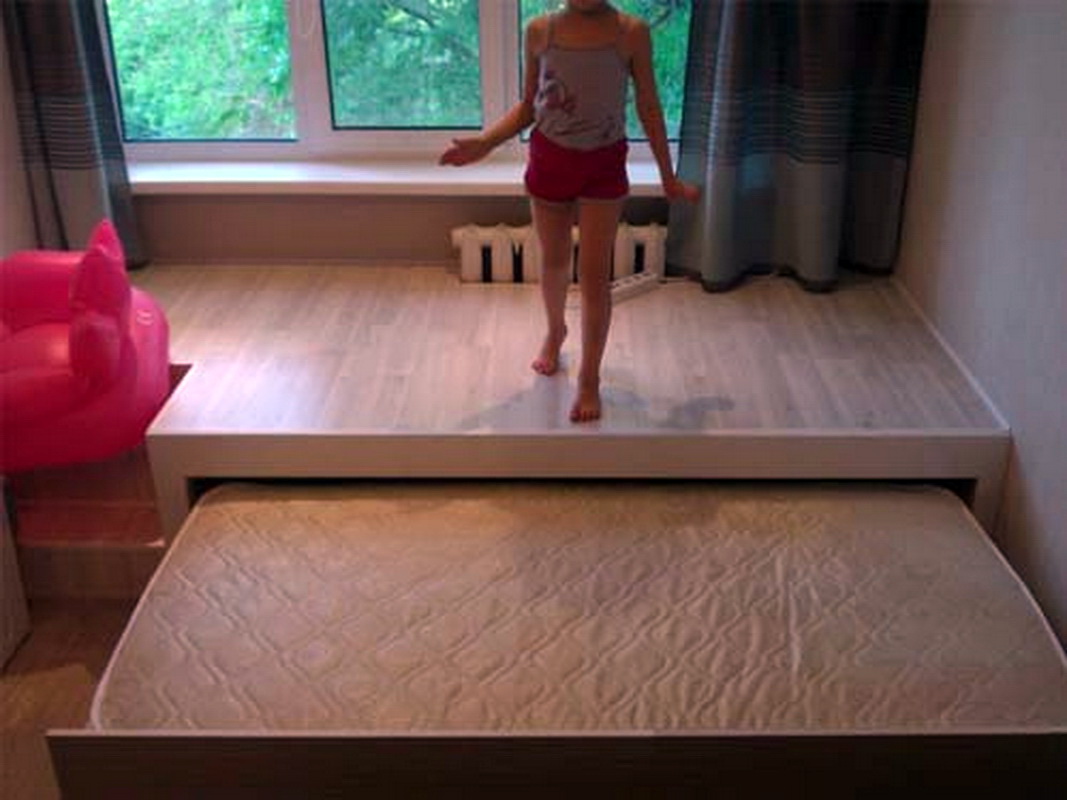 For families with small children, living in dormitories or communal apartments a small catwalk with a roll-out bed is ideal. Parents can comfortably sit upstairs, and children happily fall asleep on the roll-out bed, which in the daytime can simply be rolled up under the catwalk, thereby freeing up space for games. The presence in the podium, in addition to the bed of a large drawer with a size of 1 m, helps to maintain order in the room, because it can be removed at least some of the children's toys and small things, thereby maintaining order in a small space. The very idea of a catwalk with roll-out parts is very popular with children: now they can also collect toys and go to bed in the form of an entertaining game.