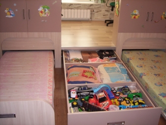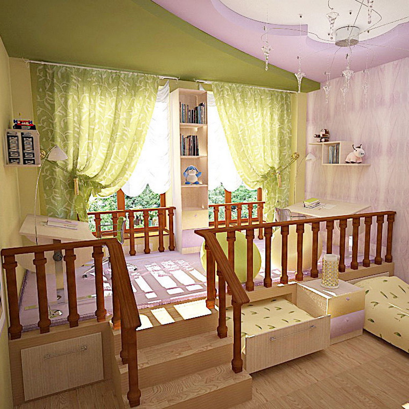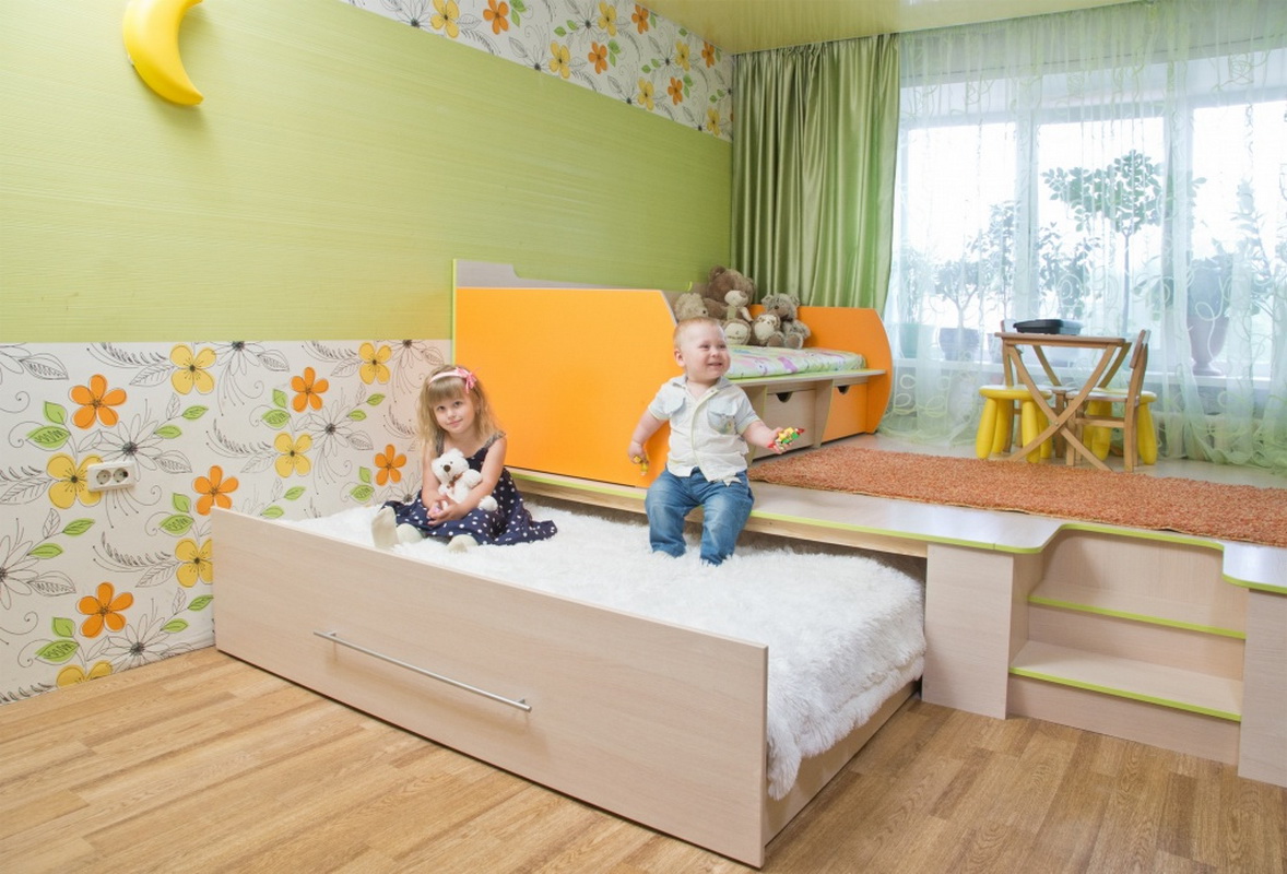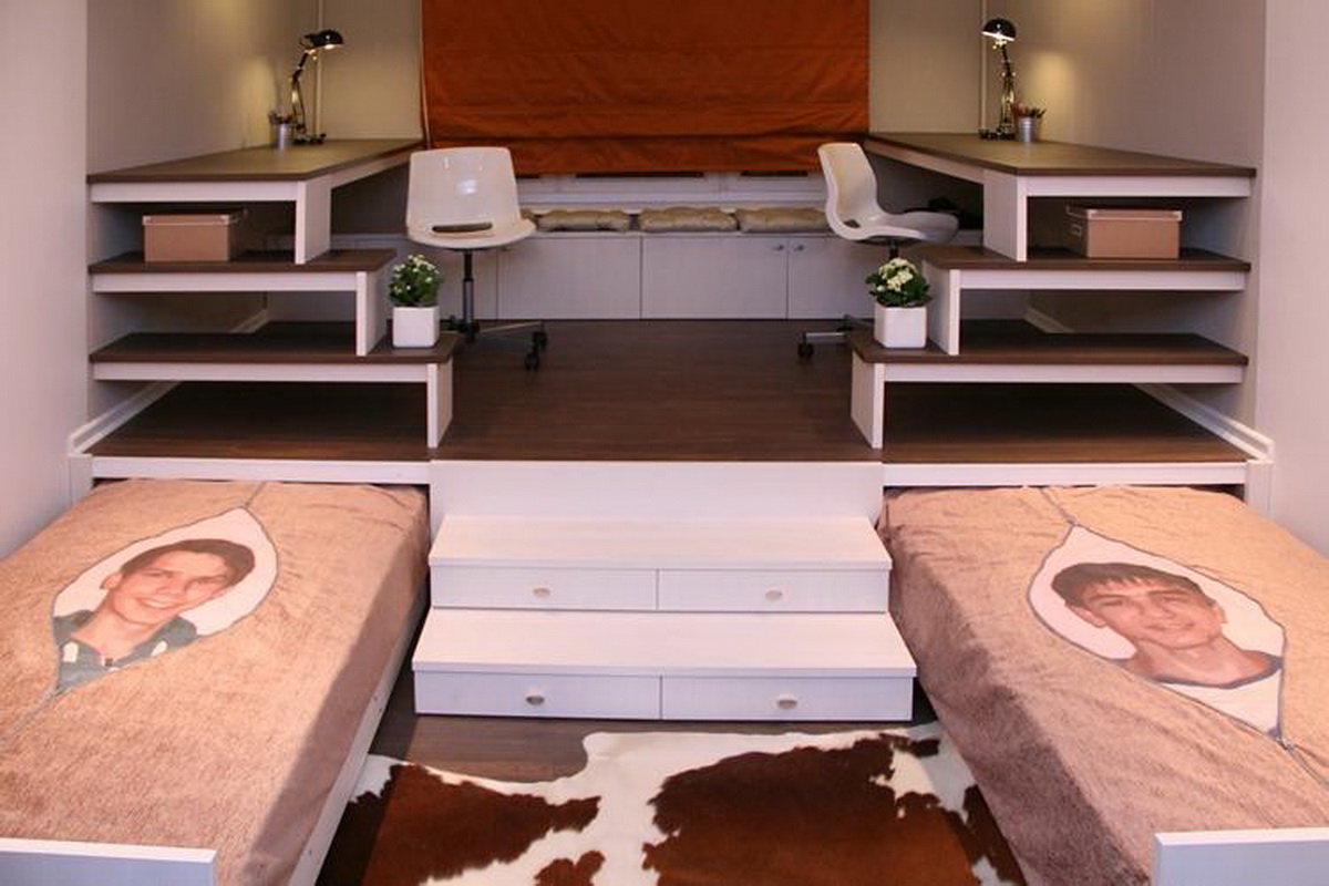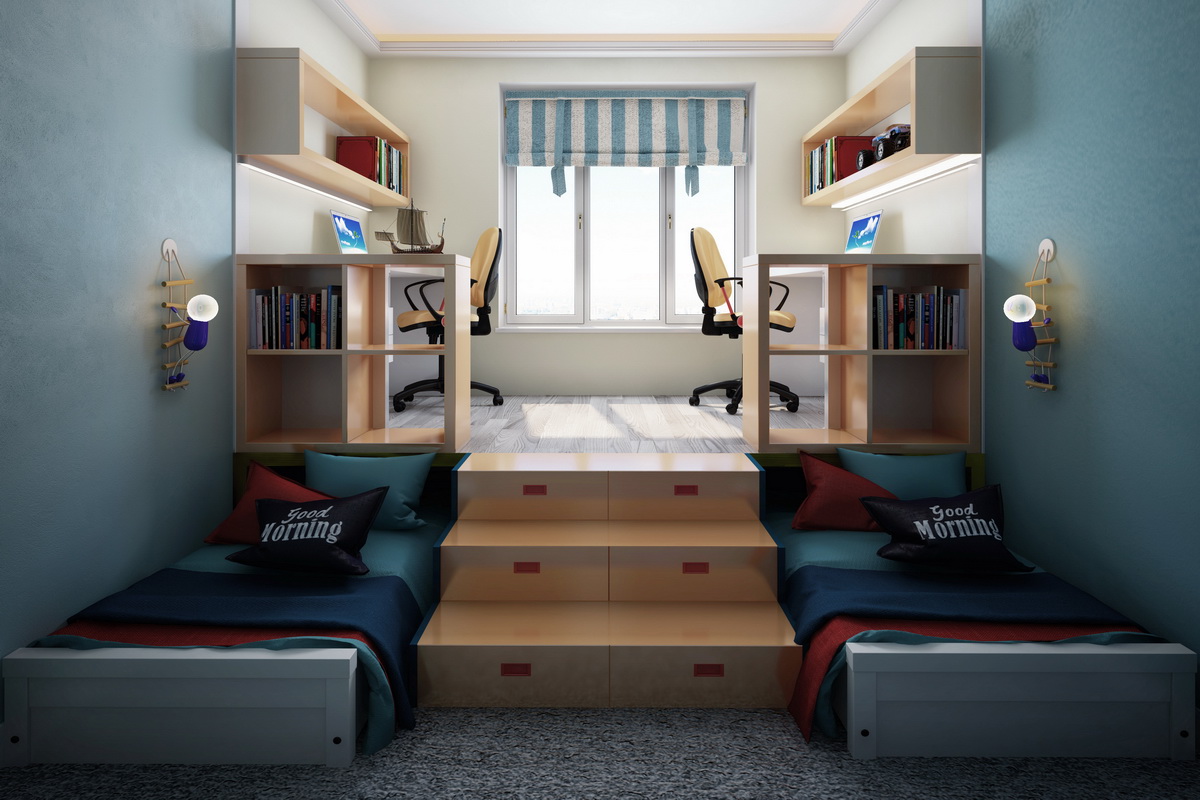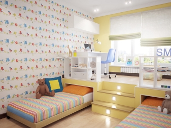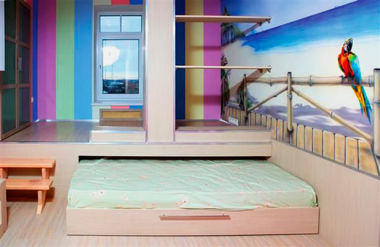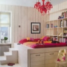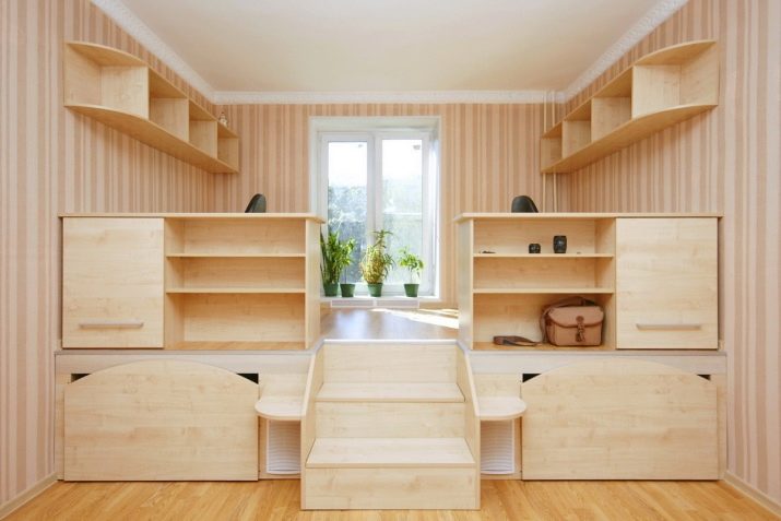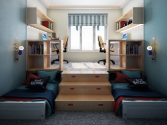 The option with built-in beds is very convenient if there are two children in a family. Berths in the form of vertically withdrawable beds symmetrically arranged to the left and right of the podium., the steps are in the middle, and at the top there is a kind of room with a working area. During the day, beds are put inside, and thus space for two in the room becomes quite enough. In this case, the podium itself looks quite high and will have at least two orThree steps, which can also be used with benefit, having built in them convenient boxes for storing children's things.