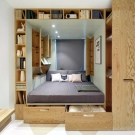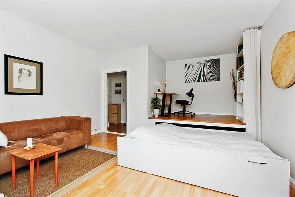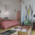 A bed with a mattress in a small one-room apartment can be planned horizontally withdrawable. It will occupy about two meters in length.The advantage of such a bed is that it can not be fully extended from the podium, using it as a small sofa or a place to rest during the day. The compartment for linen and pillows is best placed at the top of the podium: it will be a built-in drawer (or a couple of drawers) with hinged lids. Upstairs, as is the case with a nursery with a pull-out bed, you can position the workplace: a computer desk and several hanging bookcases.