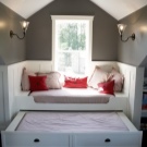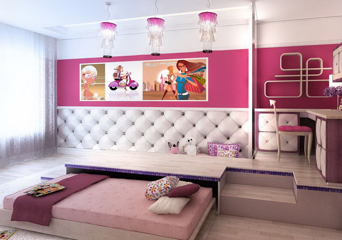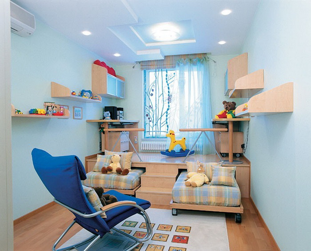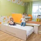 When arranging a child’s room, one should first of all conduct room zoning: a child should always have a place to sleep, play, and perform school homework. For the equipment of a children's room, both retractable and classical versions can be equally well suited. The retractable bed is good because the space in the room becomes larger. Moreover, when using this option, it is very easy to place the necessary areas in the nursery: the sleeping place itself is advanced, and the training area in the form of a table, a chair and several bookshelves is placed at the top of the podium. In the daytime, the bed is easily retracted inside the podium and the child has the perfect space to play.