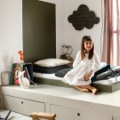 The idea of a podium with two vertically rolled-out beds I like very much large families in which there are two or more children, because in this case there are no problems with the organization of training, playing and sleeping places. In addition, if there are guests with children in the house, the upper part of the podium can be easily turned into a third berth,which can accommodate up to two people, and when the beds roll in, guests and small owners of the house get enough free space to play.
