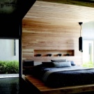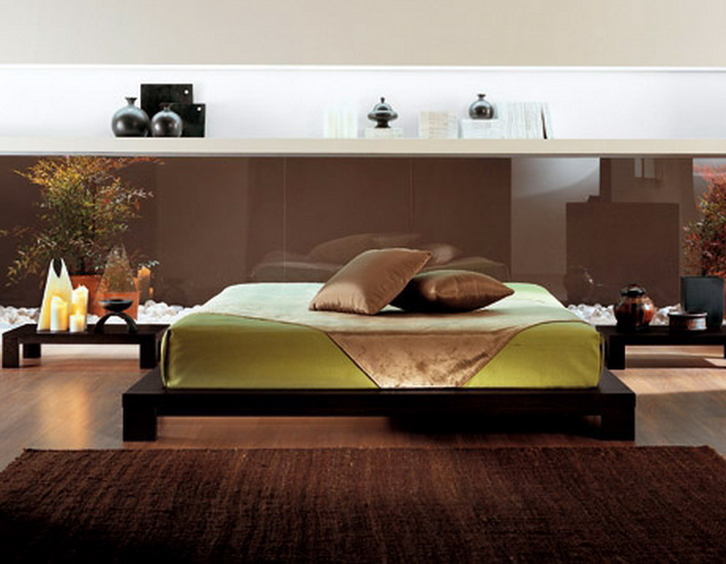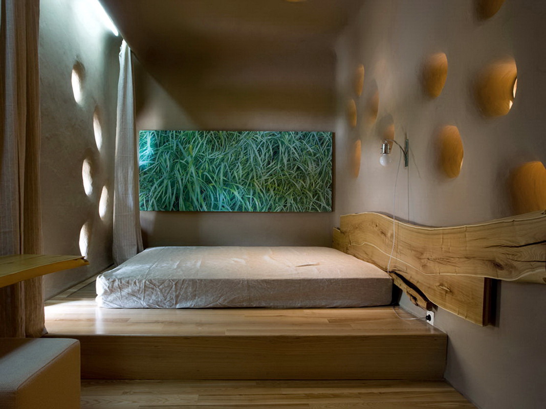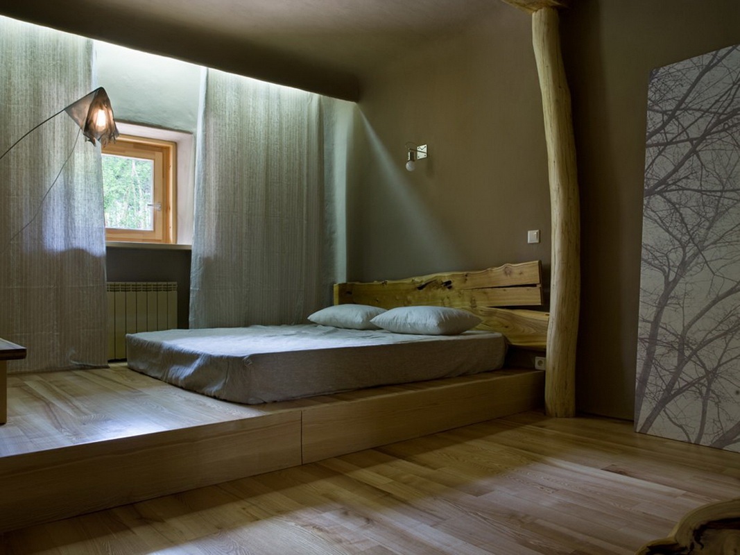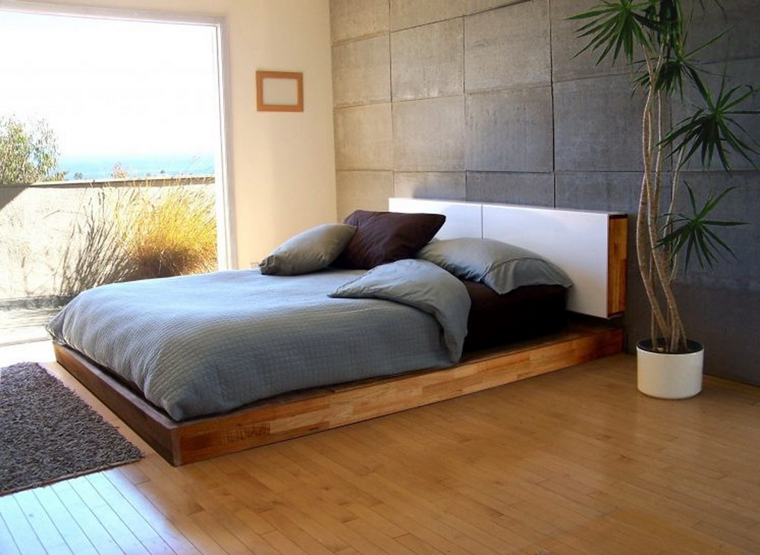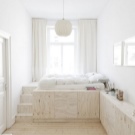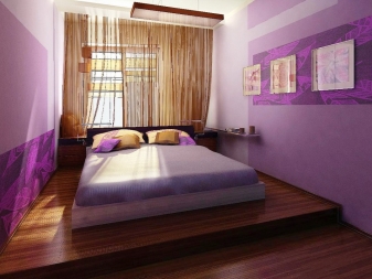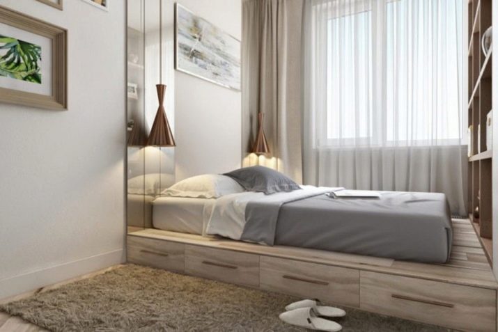 If the bed is designed by the window, the best option is a podium with drawers at the bottom. This placement saves space and adds natural light as the bed rises higher. It is better to remove the battery from the window, and instead install a special convector on the floor. Thus, the bedroom is divided into two parts, which look great, being designed in the same color and style. As a finish, you can use environmentally friendly materials from natural wood or laminate.