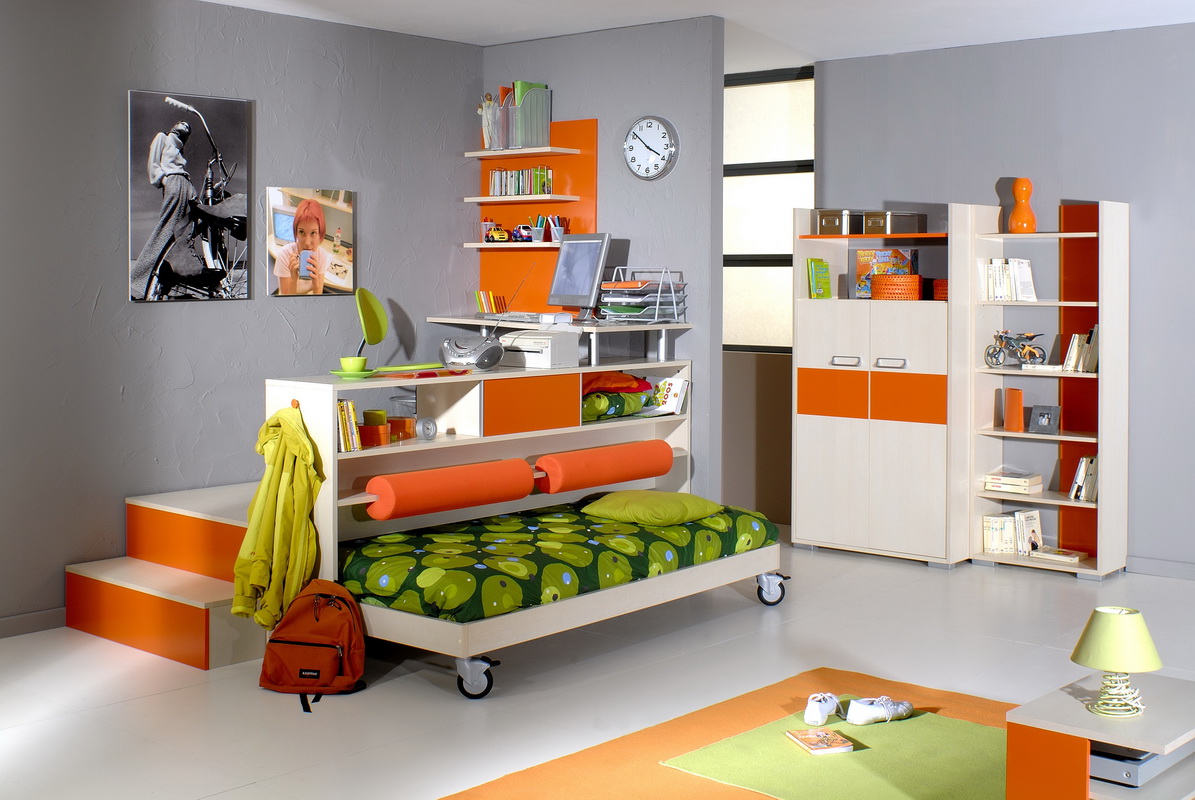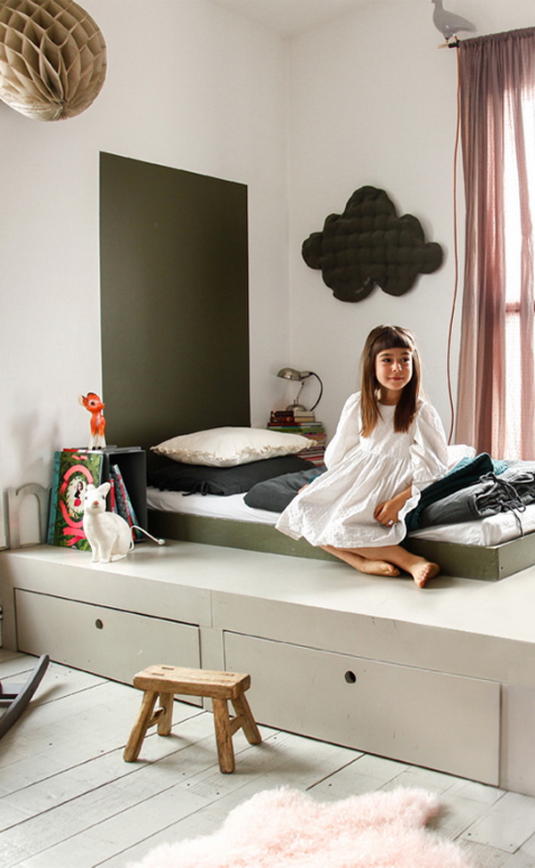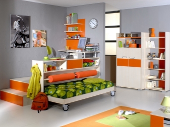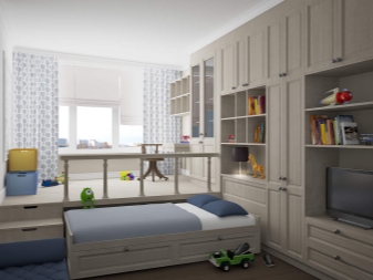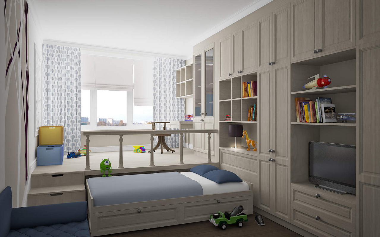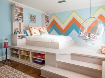 Also a good way to equip a children's room is to put a bed on a high podium with a lot of drawers, where a child can put everything: from toys to school supplies. The room will be provided with order and sufficient space for games. If the choice is to create a high podium, there you can also install a small built-in table with a sliding mechanism, which will be both practical and very convenient.
