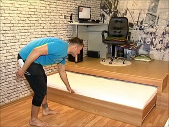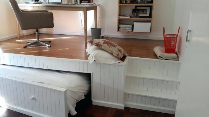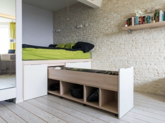 A retractable bed from the catwalk is one of the most compact and economical options. In this case, on the podium itself you can place a working corner, shelves with books or a small closet, and the bed itself will be roll-out, built in from the side. The best is considered to be a bed, gently moving out on silent rubber wheels, which do not scratch the floor.