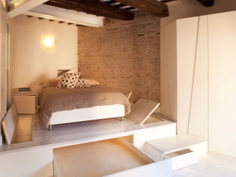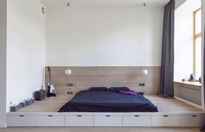 Some sources argue that the podium design as such is categorically not suitable for small spaces. Far from it. If we are talking about very high monolithic catwalks, the purpose of which is to raise the bed above the surrounding space, thereby creating a certain aesthetic effect, such an opinion may turn out to be true. These kind of beds are suitable exclusively for large rooms.