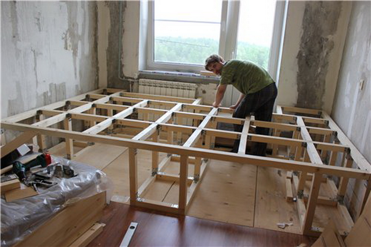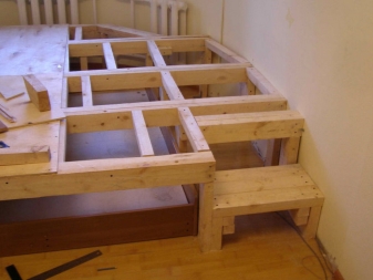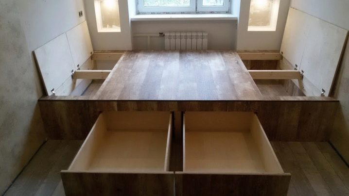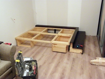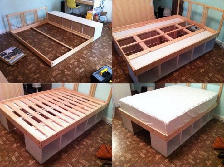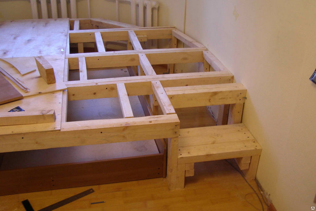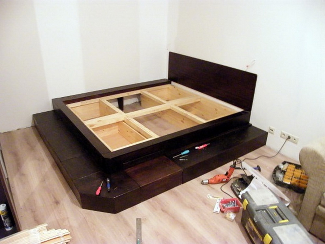 Frame podiums They are easy and simple assembly technology, they are much easier to manufacture and install yourself. The frame base is made of wood or metal or two materials are combined with each other.Inside it can be placed sliding or folding drawers for linen and other things. This is the main advantage of this technology, because it is in this way that space is saved in any room, especially if the room or apartment is small.