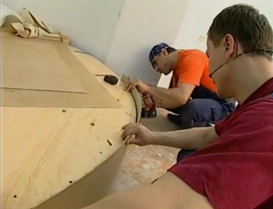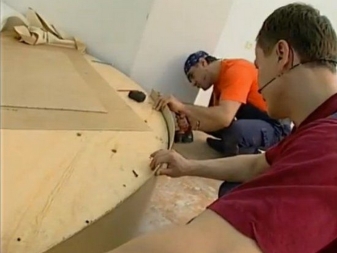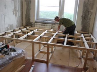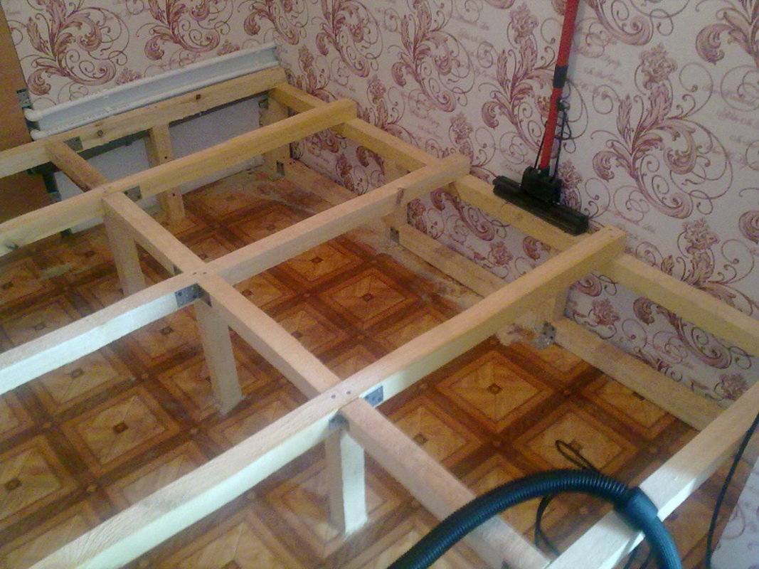 - After that, you can begin to assemble and fasten the frame of the future podium. Lags to the side walls are attached with anchors, and only then the main part of the frame is assembled. A 20 mm plywood is placed on the frame and fixed, with a small technological gap between its sheets.