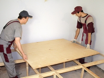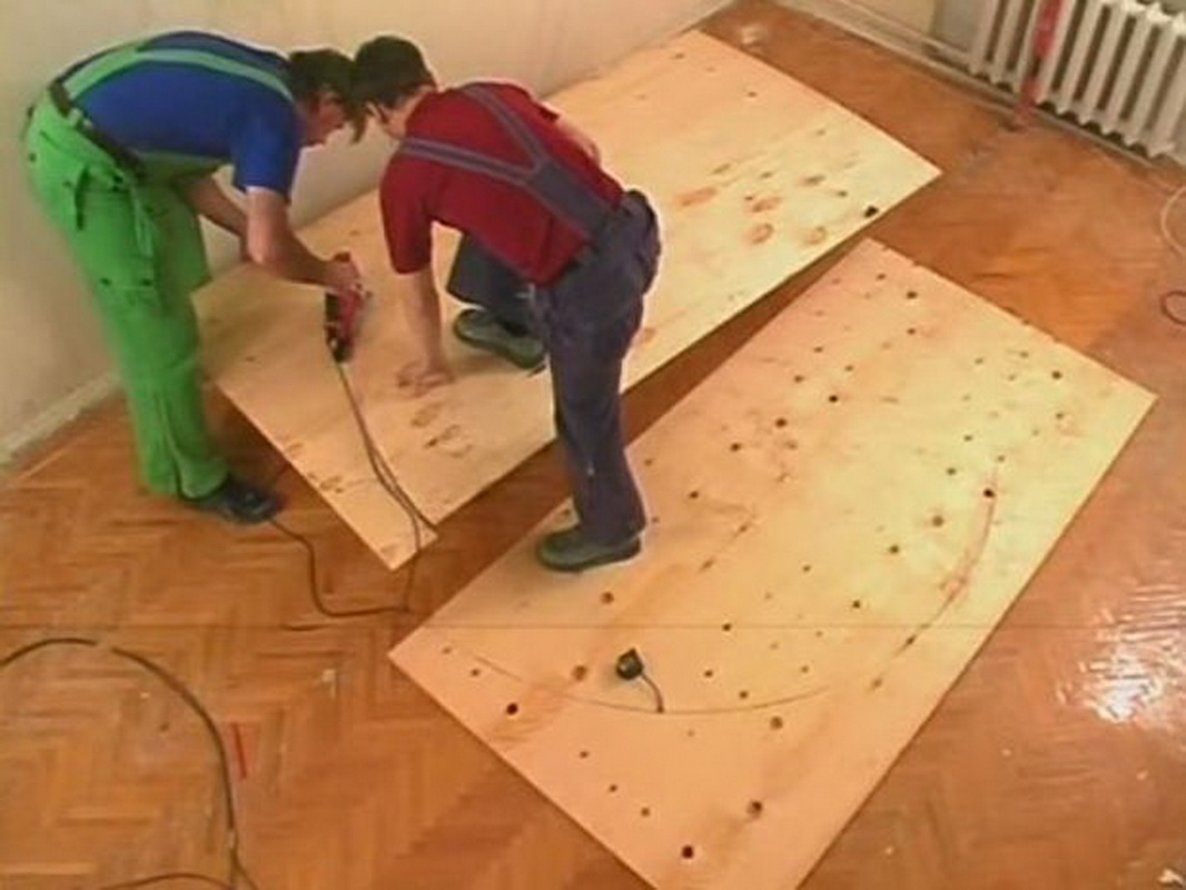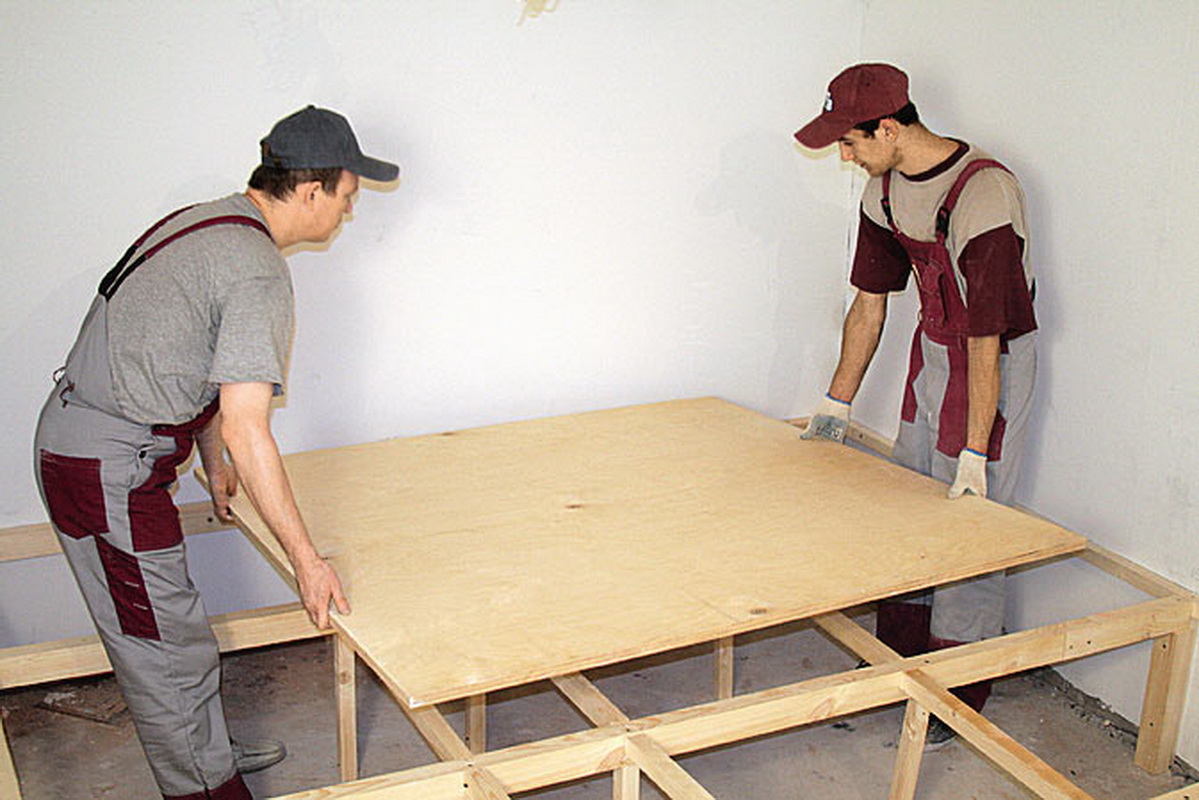 - In order to waterproof the floor lay a plastic wrap. Place the future podium close cork and plywood 10 mm. Dowels to nail plywood to the floor. The technical clearance at the joints should be about 3 mm.