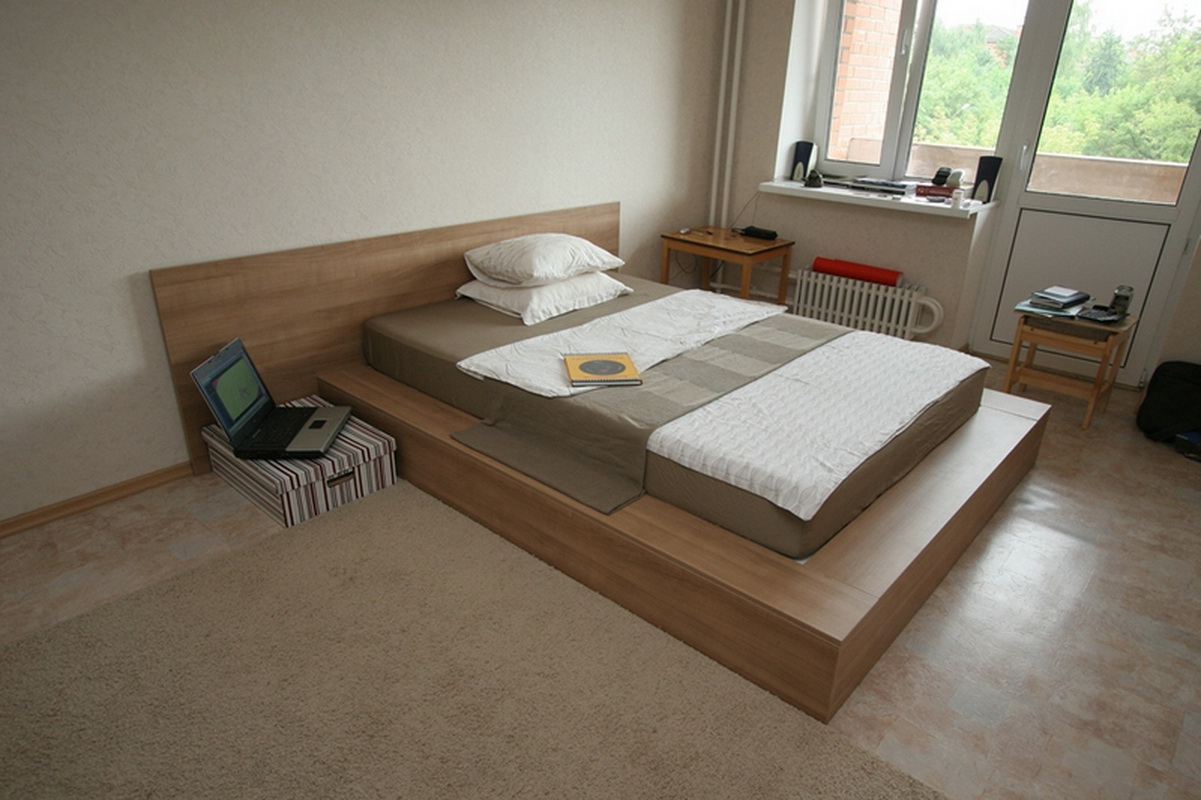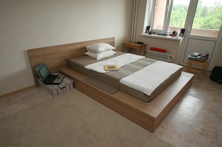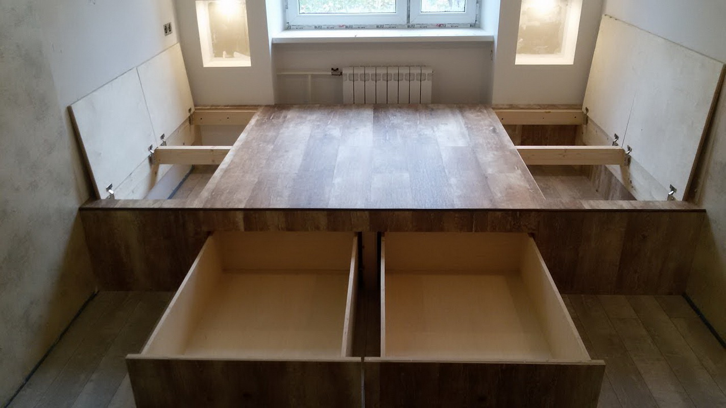 Also among the varieties of podium designs sometimes distinguish traditional (most often it is just a wooden frame, sheathed with carpet, linoleum or chipboard) and improved (just all types of more complex frame structures with fillings in the form of compartments belong to it). A simple traditional podium can be easily made with your own hands even by a person who does not have much experience in making furniture. Production will cost a minimum amount, sometimes much cheaper than buying a regular double bed.