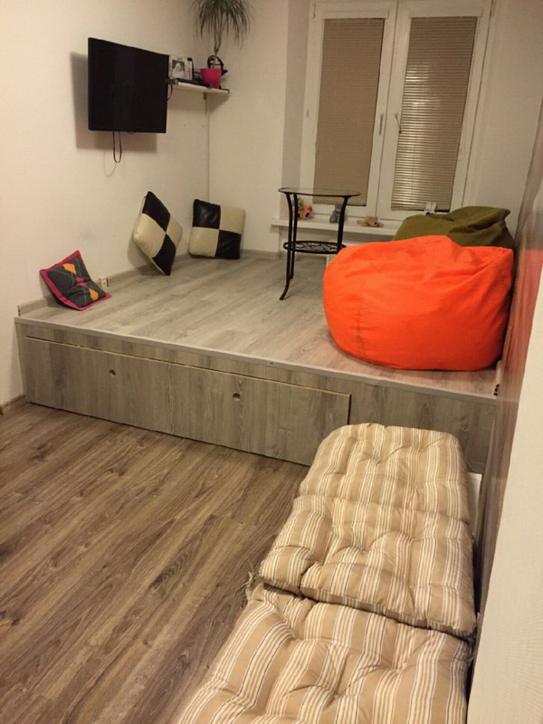 A small loggia allows you to place a bed on it. Balcony, of course, must be insulated, with warm glazing. The podium is made of furniture panels and plywood: