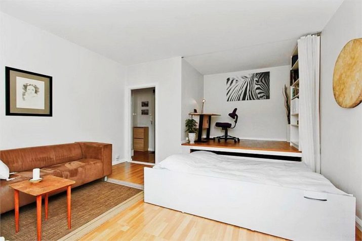 In a one-room apartment, the type of podium design will directly depend on the size of the room. With a large area under the bed you can take part of the room, which is usually fenced off with a tall cabinet or shelving with built-in drawers and shelves. The bed is arranged with the help of an ordinary wide mattress in the upper part, and at the bottom you can arrange a compact workplace in the form of a table with drawers. Thus, the podium becomes multifunctional, and a person can do different things while being in the same place. If the one-room apartment is small, the optimal dimensions of the podium for it will be approximately as follows: length - 310 cm, width - 170 cm, and height - 50 cm.