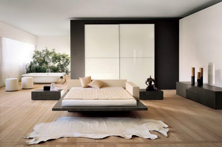 The bed located on the podium, may look different depending on the preferences of the owner and the available interior solutions. There are different types of designs. The monolithic podium is made of wood poured with concrete, and the surface of the elevation is pre-leveled with a tie. The coating is applied either the same as in the room as a whole, or it may look different: differ in color, quality of material, in order to somehow allocate a sleeping space in the surrounding space. Such a podium will serve for a very long time, despite its solidity and great weight, which, in fact, is not such a big drawback.