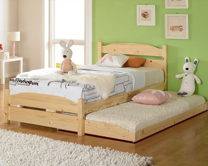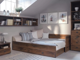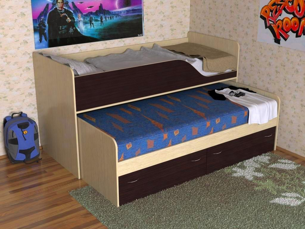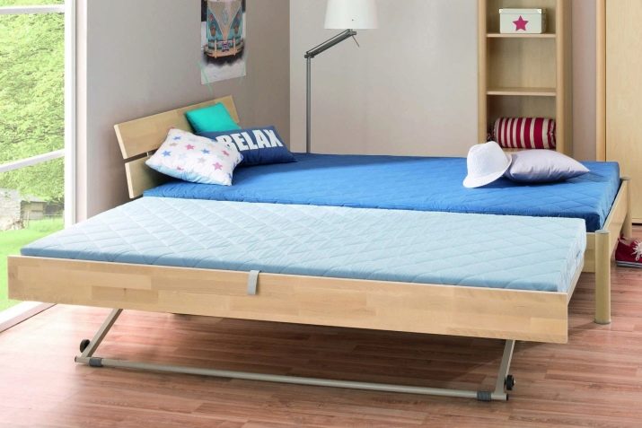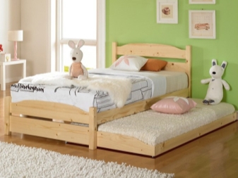 In families where there are children of the same age, the two-story sliding bed will become irreplaceable attribute. It saves space ideally, because during the day the lower tier can be pushed under the upper one and be content with the parameters of a single bed. Such a bed is not bought for growth, but can be supplied with tables, which are attached to the back of the frame. For large families even construct three-tier products.