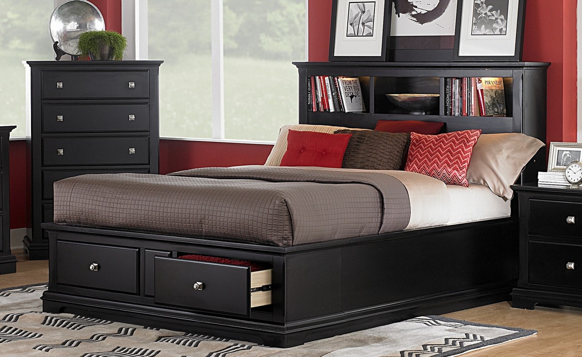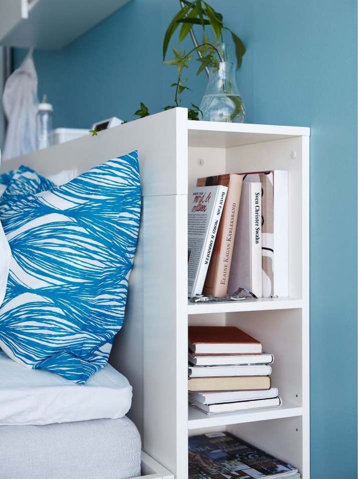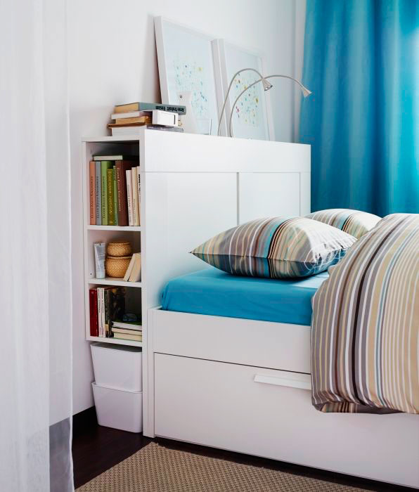- Brimnes, Ikea. Perhaps the most famous bed with extra storage. The model is available in two sizes: 140 × 200 cm and 160 × 200 cm.It has 4 drawers for storage below and a bookcase at the head with open shelves on the sides. One of the advantages of the bed is the presence of an additional hole for cords on the top shelf (floor lamps or “charging” for mobile) and a convenient design for books, all sorts of necessary trifles. If we talk about the material of the bed, it is chipboard and fiberboard, covered with film.
