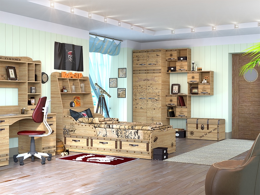 You can use a more clever way. - install open wall shelves and a pair of closed cabinets. You can create a whole niche U-shaped, into which the bed with a low headboard will fit perfectly.