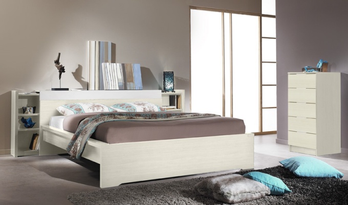 - Prestige, Mary-Mebel. A bed with a bar at the headboard - this is what a furniture manufacturer calls this product. The bed has a small “storage” with a width of 19 cm, in which the shelves are located inside and are advanced due to simple movement. The bed body material is chipboard, its style direction is modern.