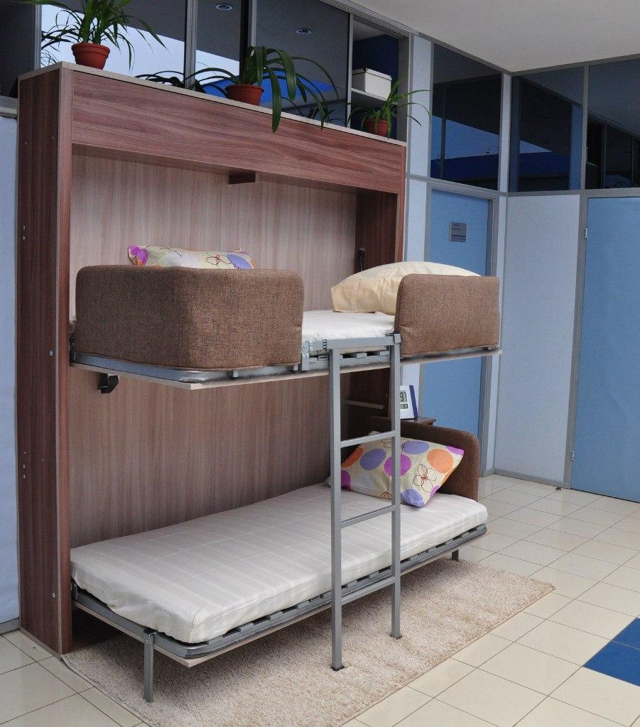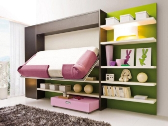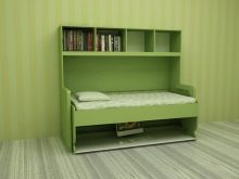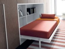 - Lifting folding bed-transformer You can disguise under the guise of other furniture in the apartment, for example, by installing it in a closet or wall. The mechanism on the basis of pneumatics lifts it up and puts it in a special place. Most often it is an adult double seat, but there are similar models designed specifically for children. The mechanism itself is quite simple to use, and a school age child can handle it without difficulty.