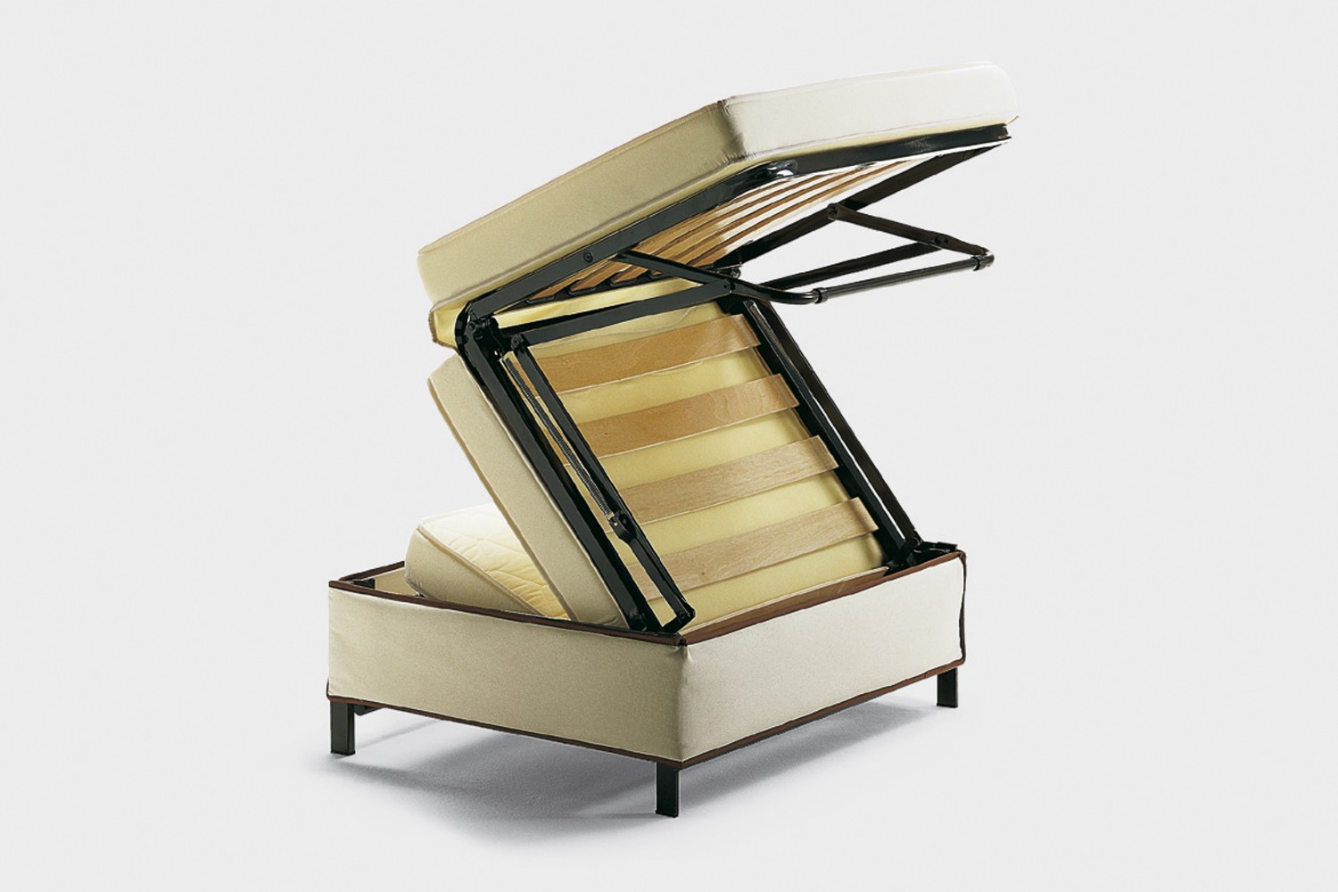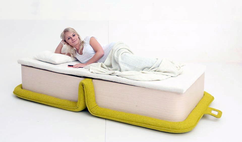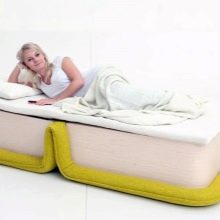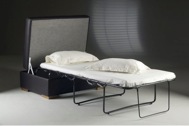 - One of the most interesting and eye-catching models is ottoman bed. He is deservedly called the most modern folding bed in the world. When folded, it looks like a soft padded stool, the dimensions of which are very compact. But if you lift the lid, inside is the most common metal construction on the legs with a comfortable mattress that extends vertically. The model is easily transformed back: it is enough just to fold it like a regular cot and put it inside the pouf.