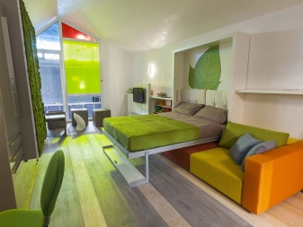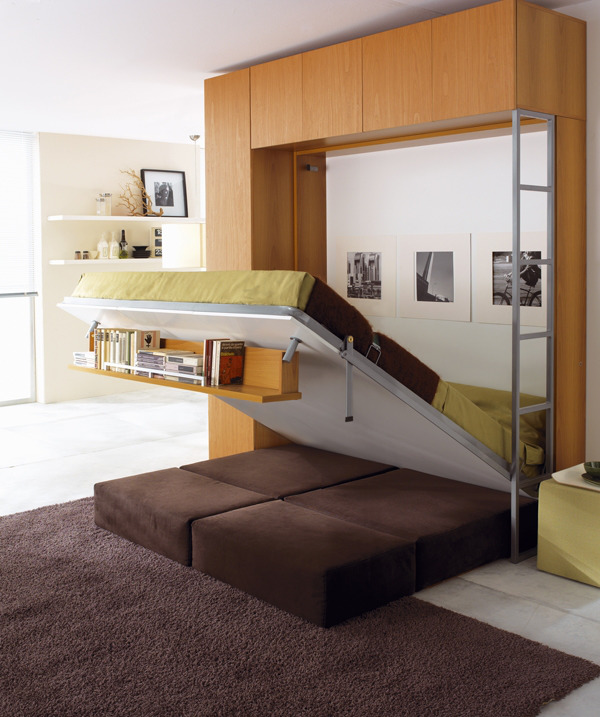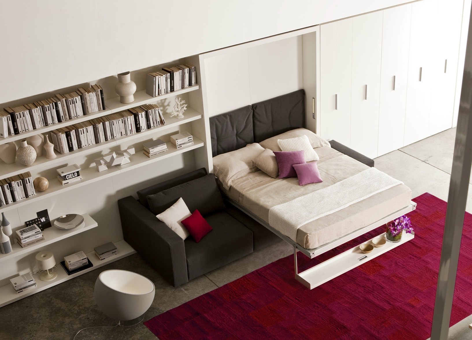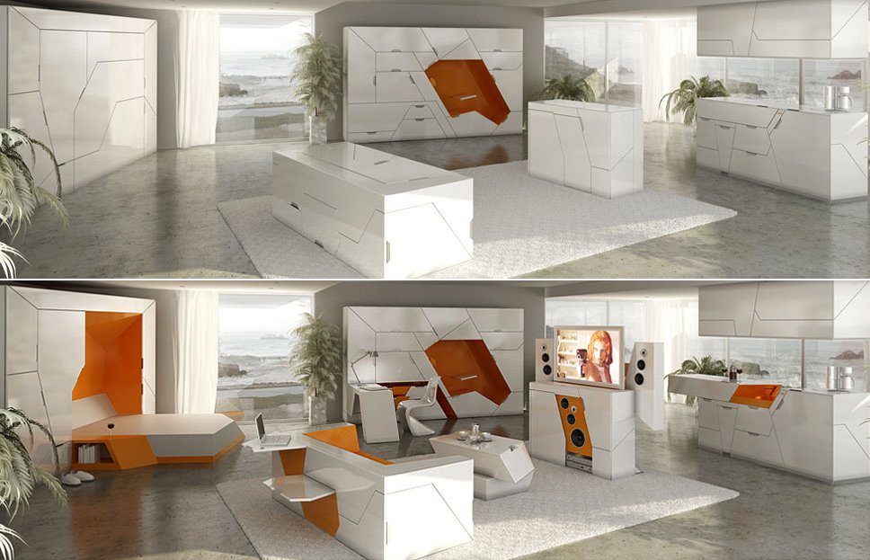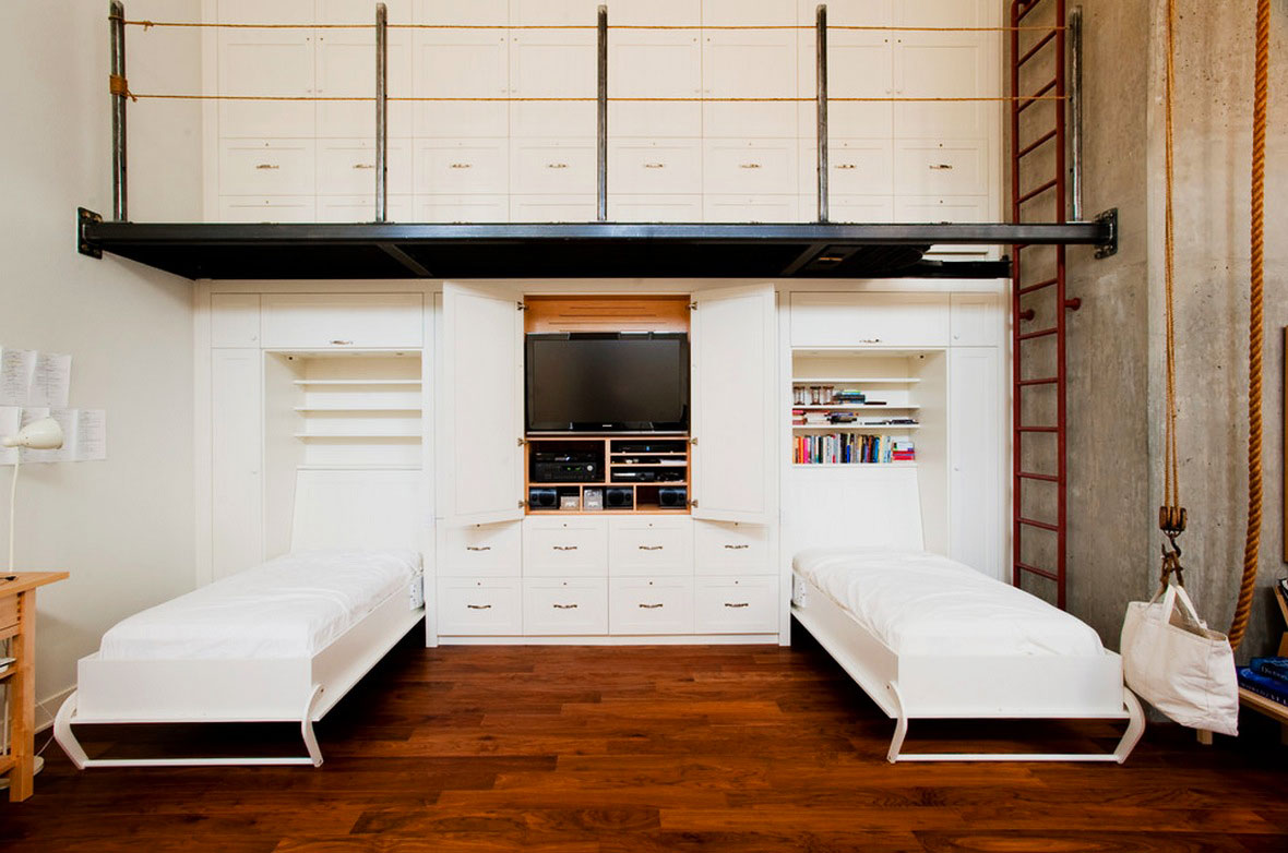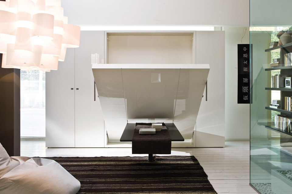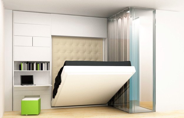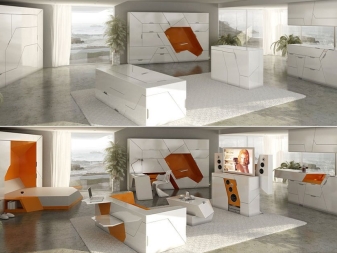 - American firm Resource Furniture developed the concept of a spatial solution, which has become a kind and very convenient know-how: one thing that occupies minimal space in a room can serve as a bed with shelves, as well as a working, dining and even coffee table.